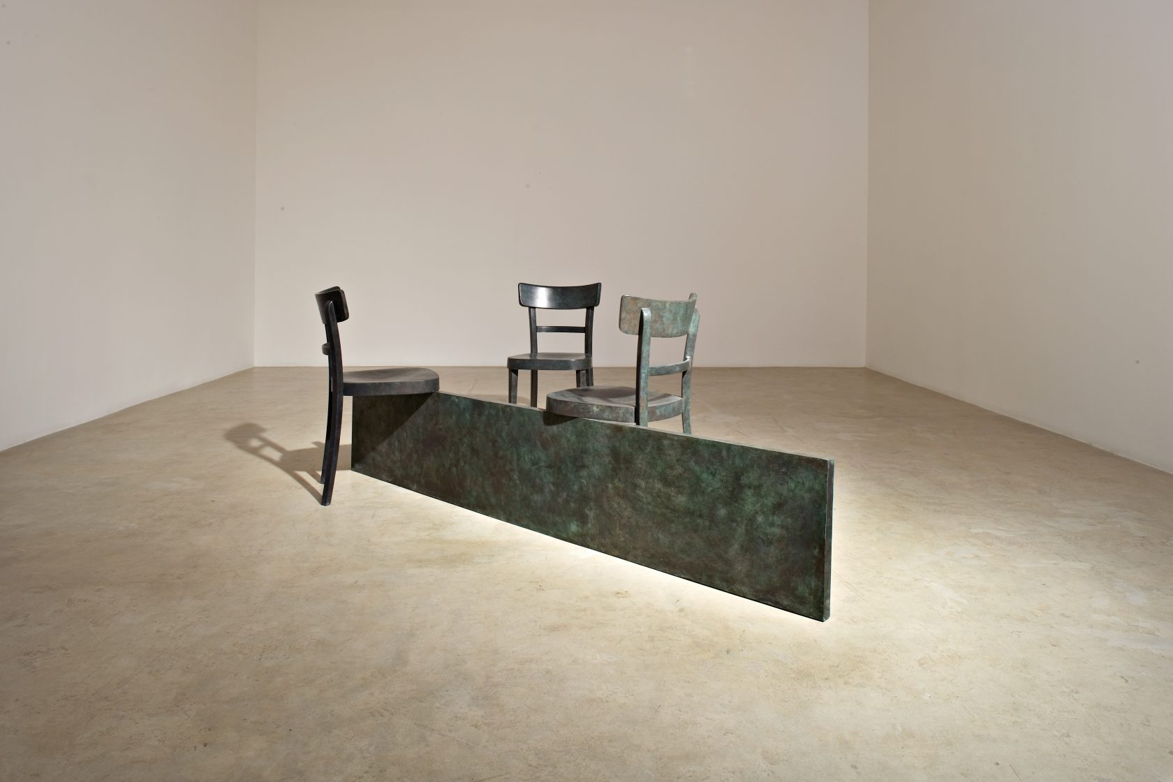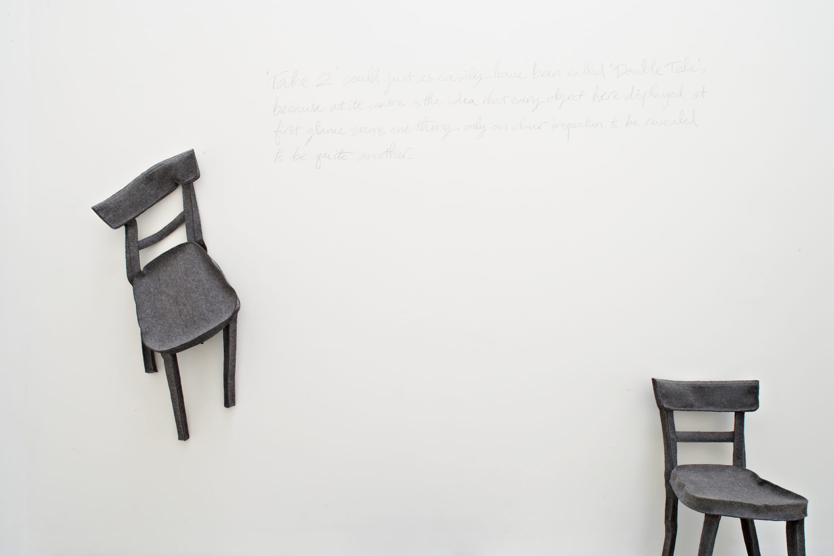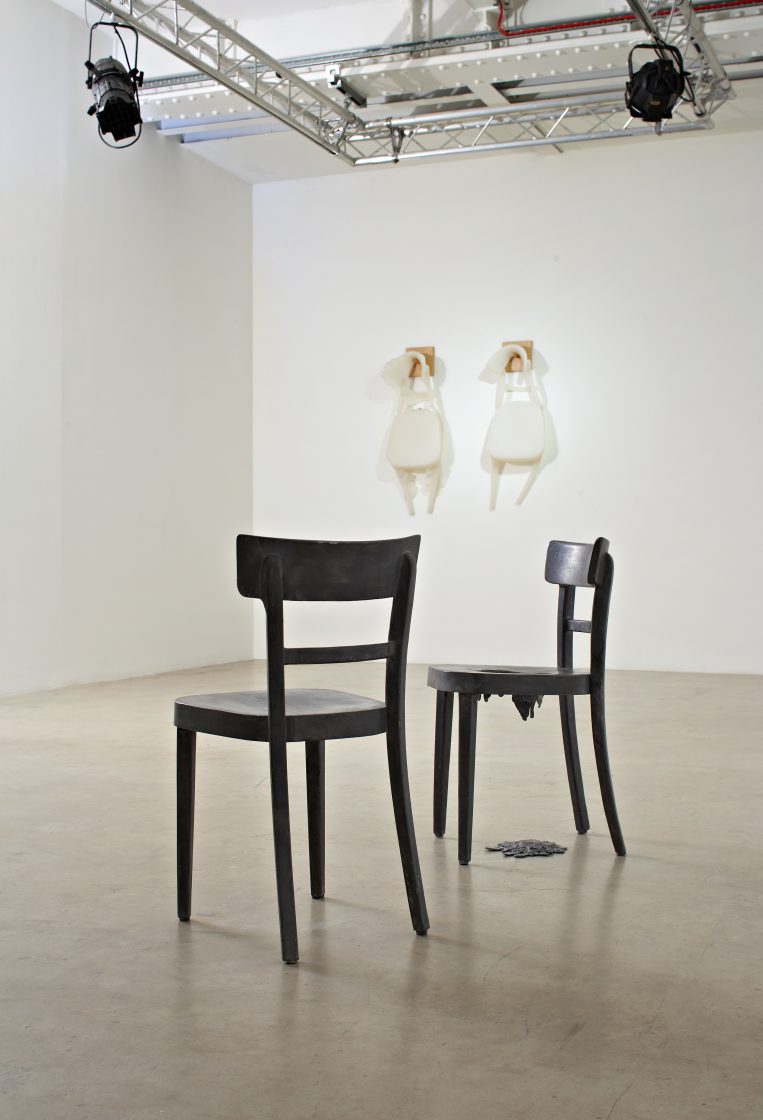 Works exhibited include, ‘Spitting image’ all cast in transparent resin, a range of ‘Neon‘ lights created with an expert glassblower, ‘A Level Playing Field’ a table tennis piece formed from a hot-rolled steel table, ‘A Game of Draughts’ an interpretation of the traditional game made in black granite using sake cups, and ‘leaden’ a blackened lead-cast chair with a hole melted through its seat.