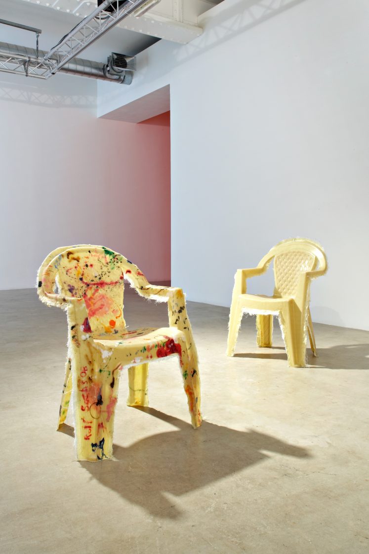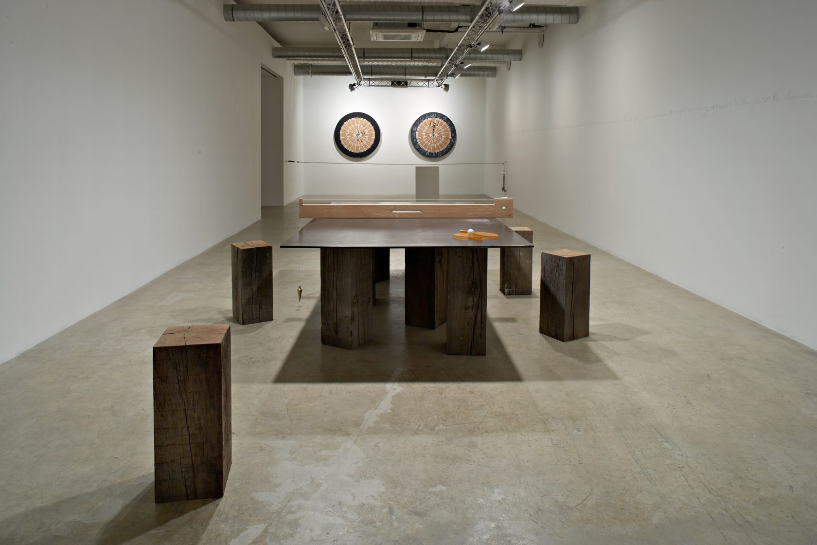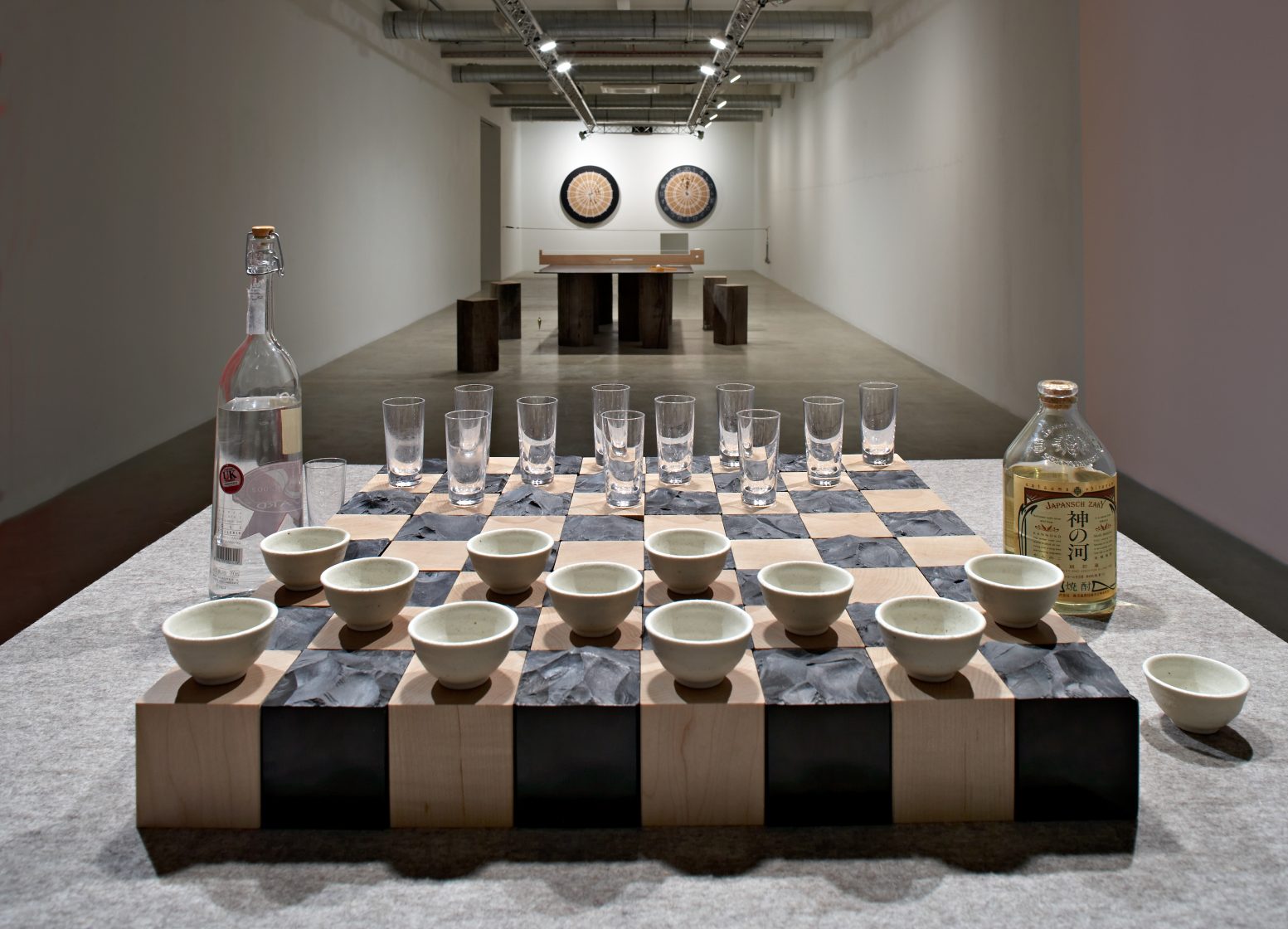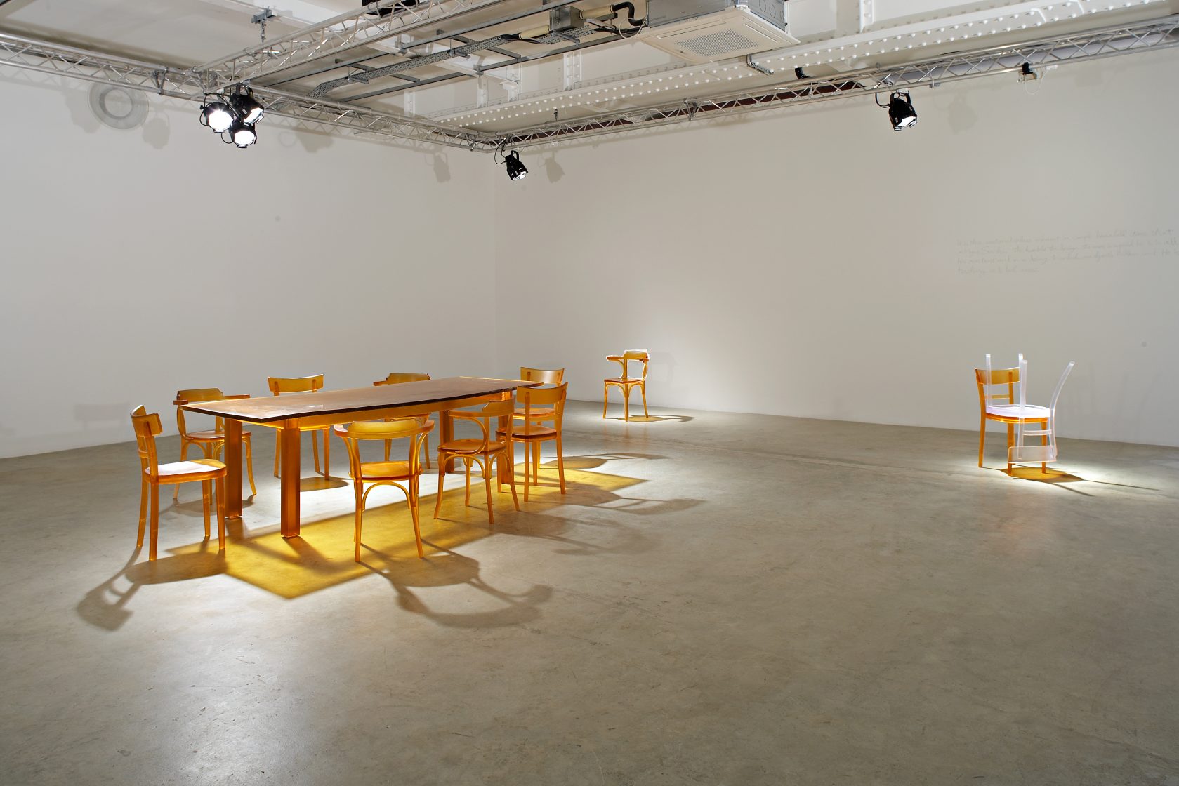 Works exhibited include, ‘Spitting image’ all cast in transparent resin, a range of ‘Neon‘ lights created with an expert glassblower, ‘A Level Playing Field’ a table tennis piece formed from a hot-rolled steel table, ‘A Game of Draughts’ an interpretation of the traditional game made in black granite using sake cups, and ‘leaden’ a blackened lead-cast chair with a hole melted through its seat.