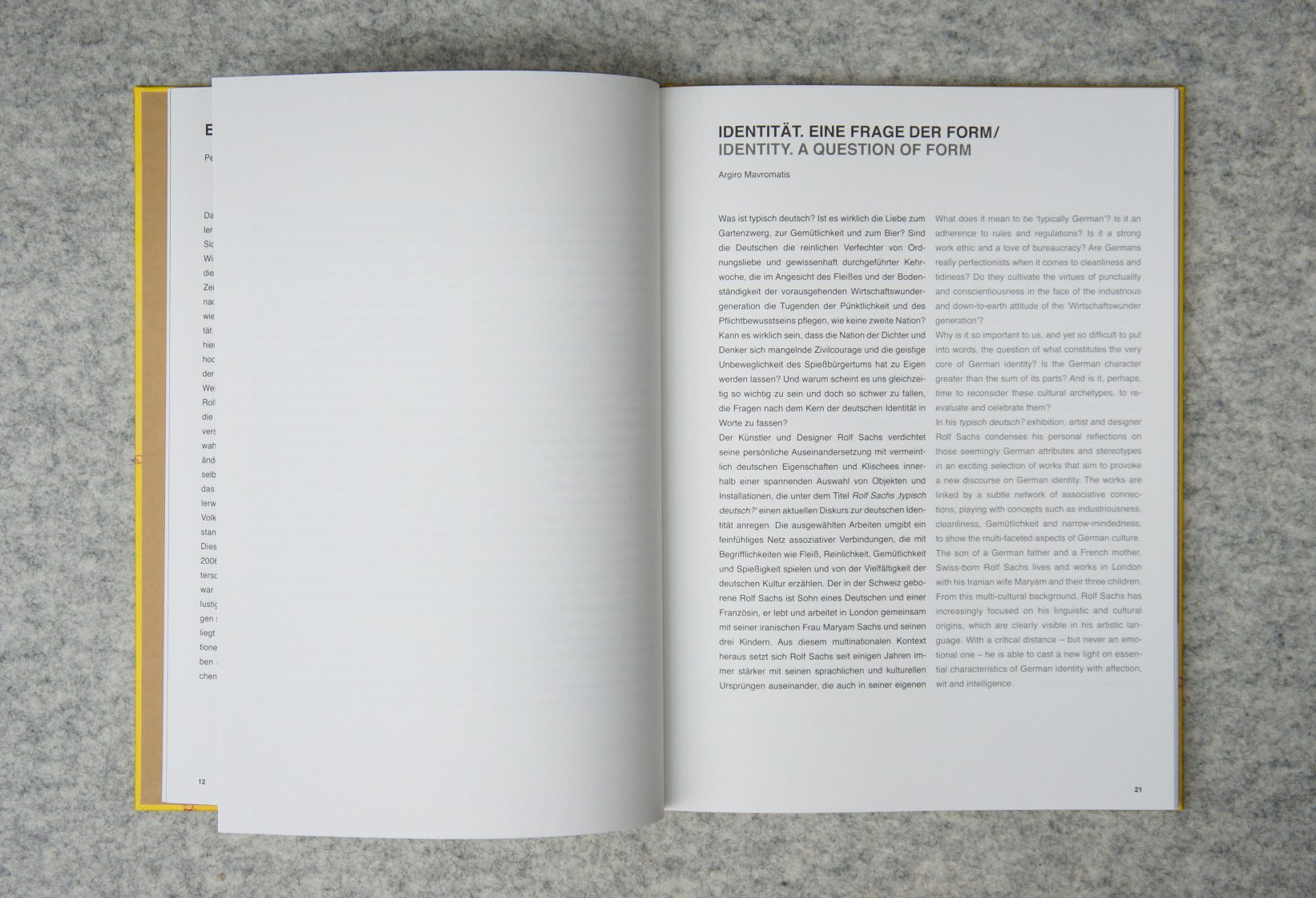 Inspiriert von der Vielfältigkeit der deutschen Kultur und den damit verknüpften Besonderheiten und Klischees analysiert der in London lebende Künstler Rolf Sachs Begriffe wie Reinlichkeit, Wanderlust, Bodenständigkeit, Schwermut und Geselligkeit und deutet diese auf vielfältige, subtile und zuweilen humorvolle Weise. Die Ergebnisse visualisiert er für seine Ausstellung in Form ungewöhnlicher Objekte oder Installationen, die zur Interpretation einladen und sich im Spannungsfeld zwischen Kunst und Design bewegen. Sie zielen darauf ab, den Betrachter die Dinge mit anderen Augen sehen zu lassen und über die deutsche Mentalität und deren Eigenheiten nachzudenken.
