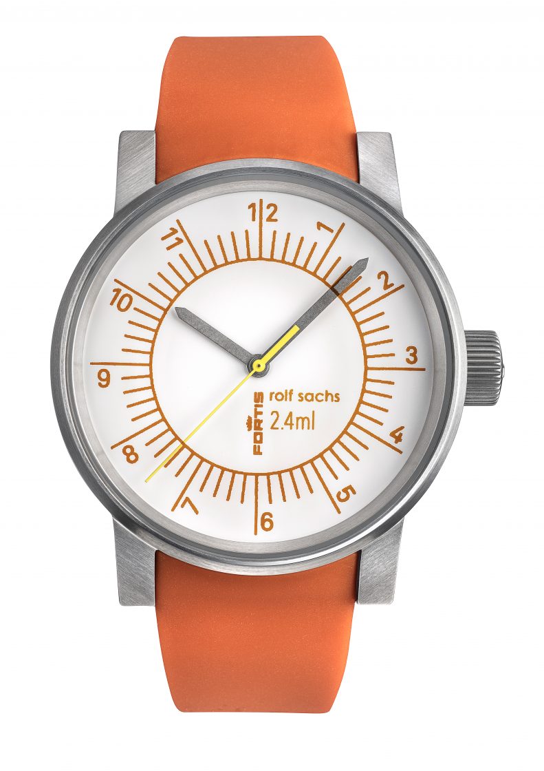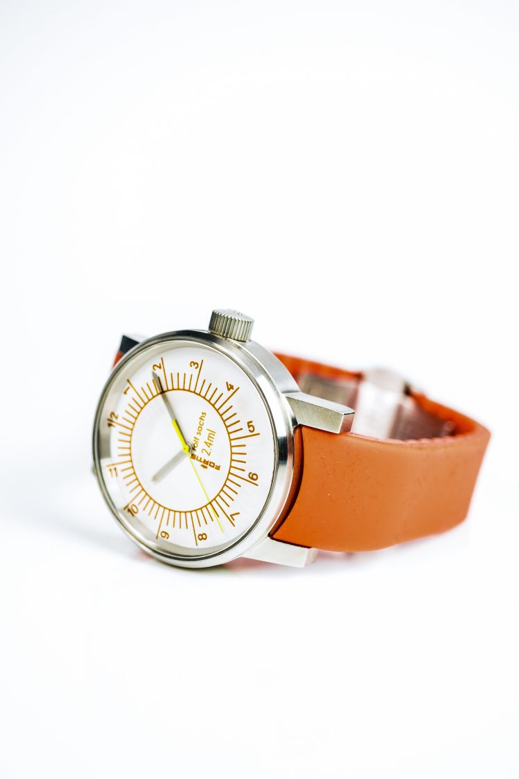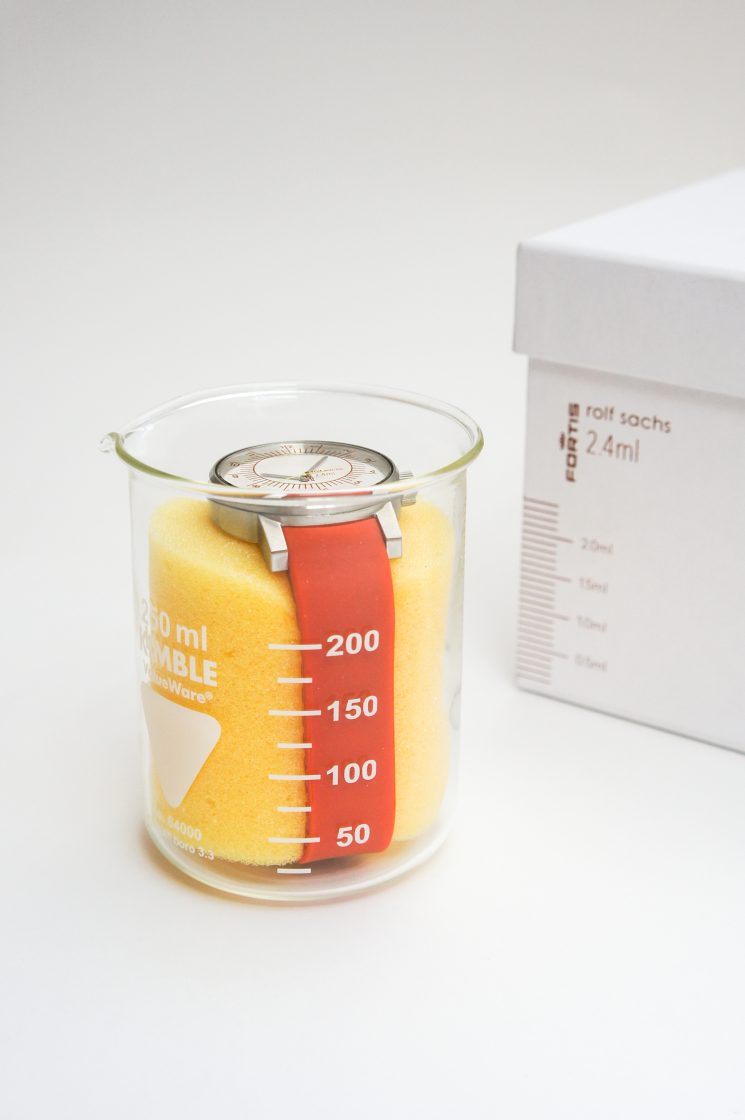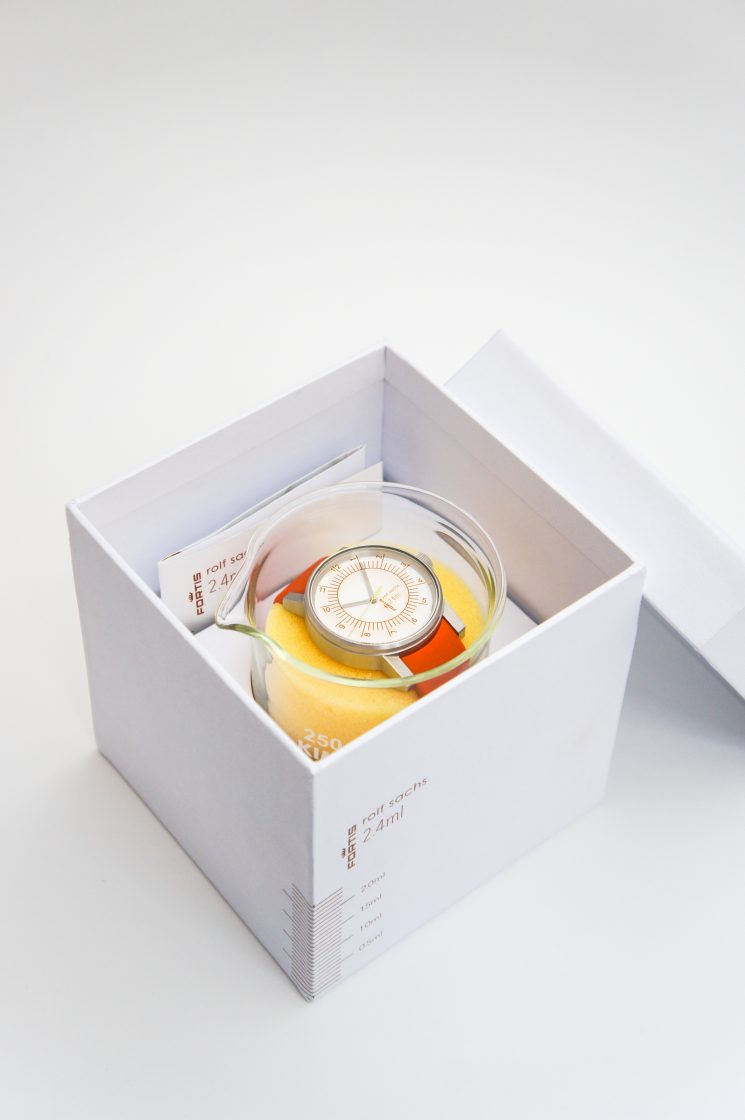 Drawing inspiration from scientific methods, the process and visual language of laboratories and laboratory glassware has been adopted to create the ‘2.4ml’ watch. Sachs applies the handcrafted process of “ambering” (amber staining), a completely new technique in watchmaking, to the glass surface of the watch to replicate the visual language of ‘graduation’ marks typically found on laboratory measuring instruments. This process is carried out by hand and involves applying the artwork directly onto the glass surface, dipping it into the amber stain tank and baking it in a high-temperature industrial oven. This leaves the watch with the numerals, graduated minutes, hour indices and logos directly cauterized onto the scratch resistant glass surface. This technical, yet handcrafted process, results in slight variations in finish and colour, making each piece unique.