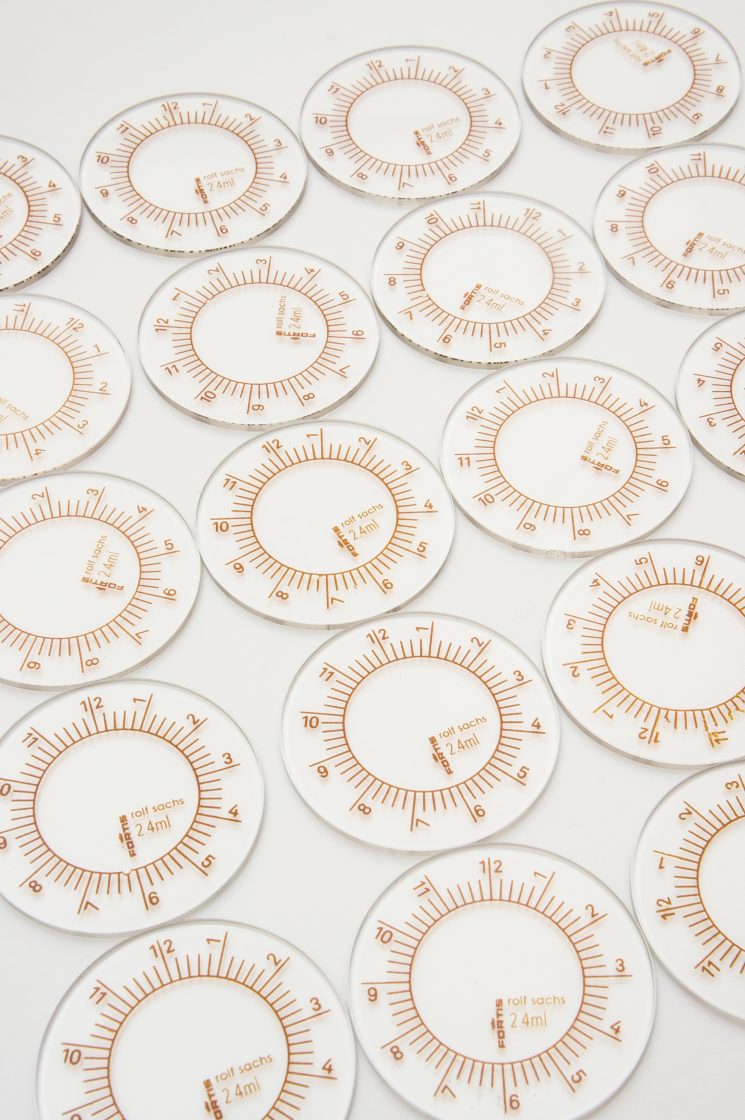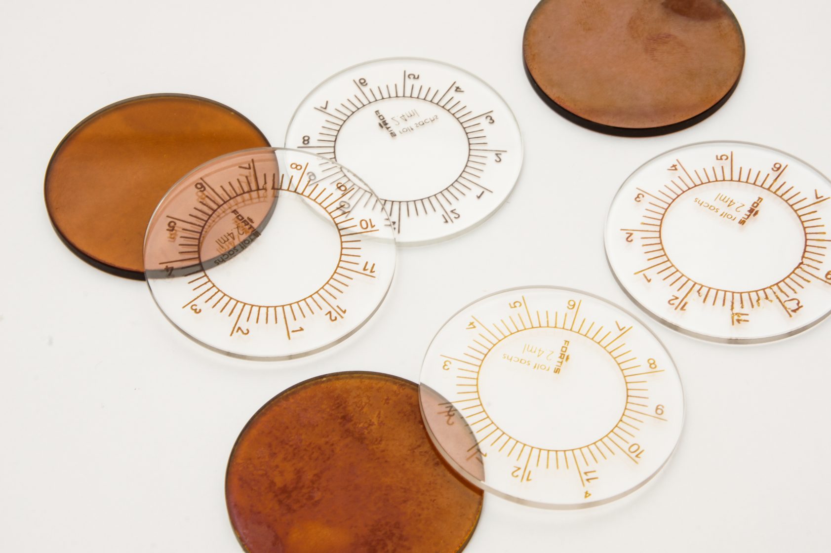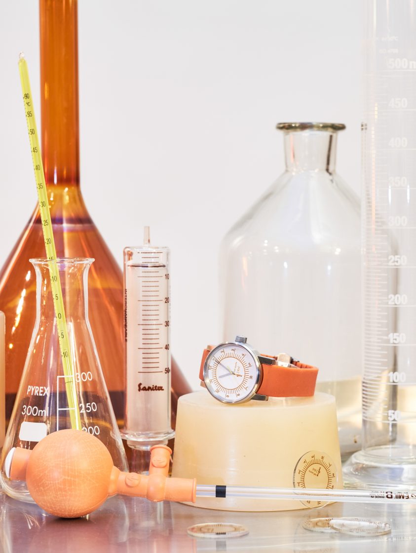 Drawing inspiration from scientific methods, the process and visual language of laboratories and laboratory glassware has been adopted to create the ‘2.4ml’ watch. Sachs applies the handcrafted process of “ambering” (amber staining), a completely new technique in watchmaking, to the glass surface of the watch to replicate the visual language of ‘graduation’ marks typically found on laboratory measuring instruments. This process is carried out by hand and involves applying the artwork directly onto the glass surface, dipping it into the amber stain tank and baking it in a high-temperature industrial oven. This leaves the watch with the numerals, graduated minutes, hour indices and logos directly cauterized onto the scratch resistant glass surface. This technical, yet handcrafted process, results in slight variations in finish and colour, making each piece unique.