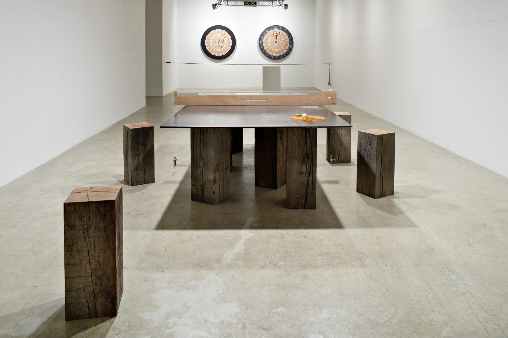 A playful deconstruction of this universal game of table tennis using hot-rolled steel, oak tree trunks and a spirit level, transforming it into a monolith, sculptural form.