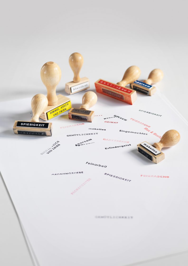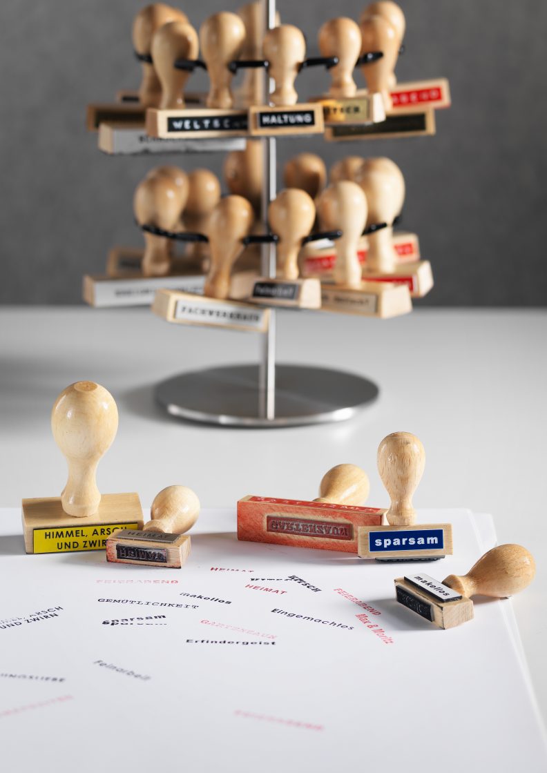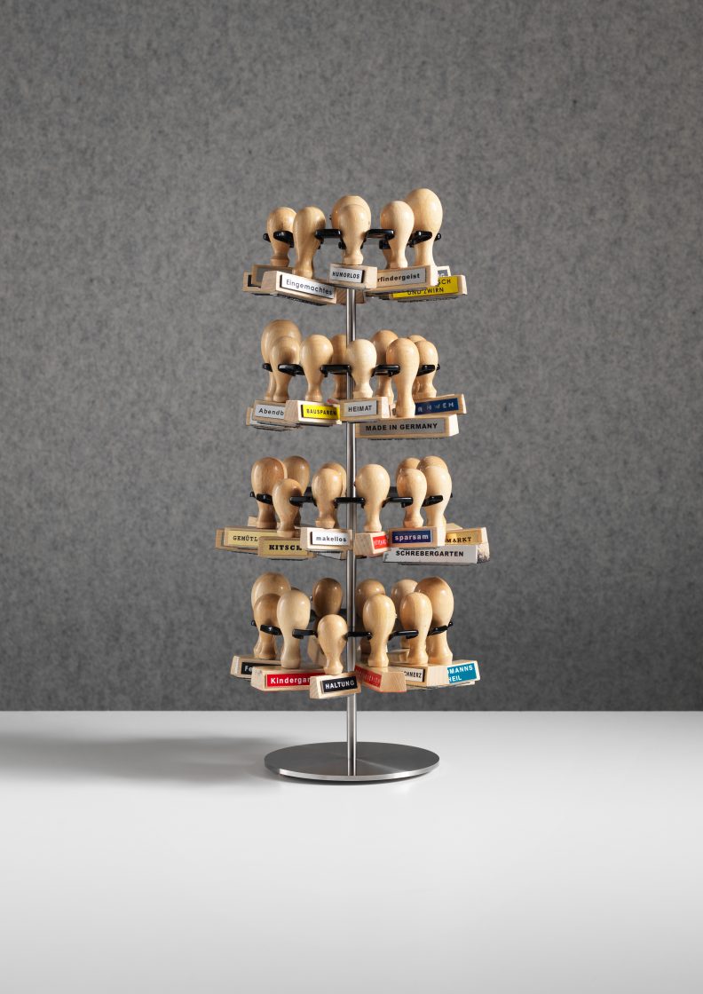 Using Martin Gerhard Reisenberg’s comment as its starting point; ‘As soon as the first stamp exists, an office very quickly forms around it’, this piece affectionately comments on the German love of paperwork and bureaucracy, in the form of a series of ink stamps displayed on a stand, with words from German popular culture and history.