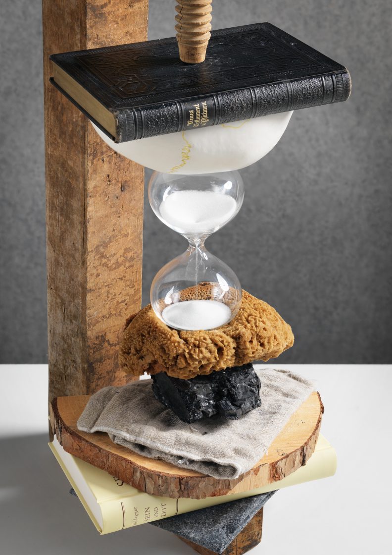 wooden clamp, bible, anatomical skull model, sand timer, natural sponge, anthracite coal, linen, pine, lead, steel