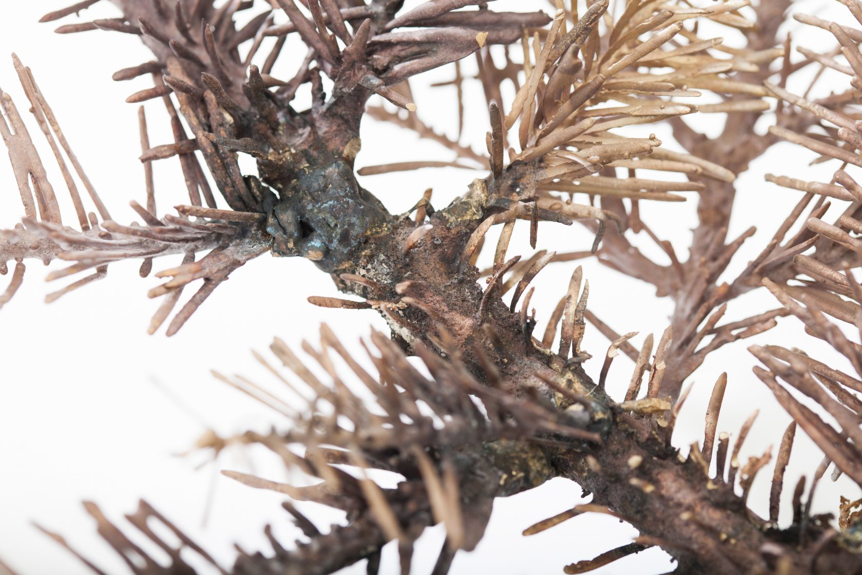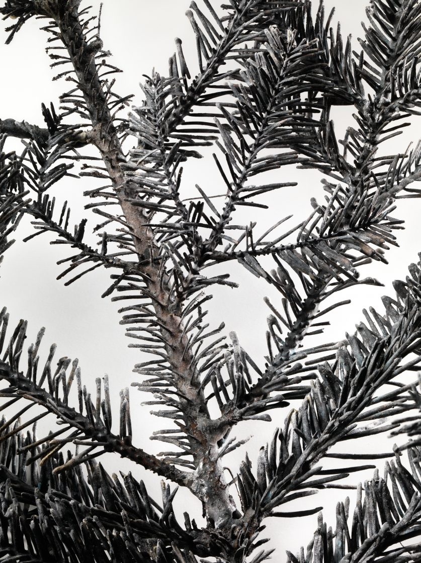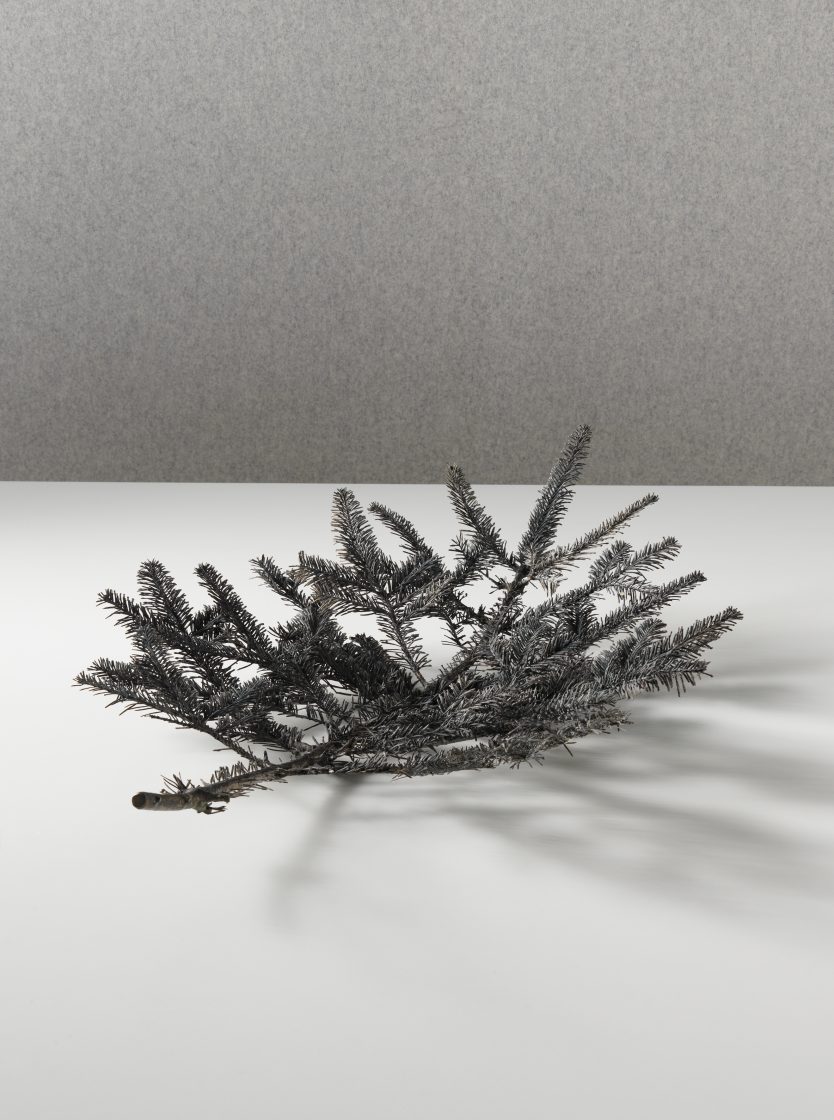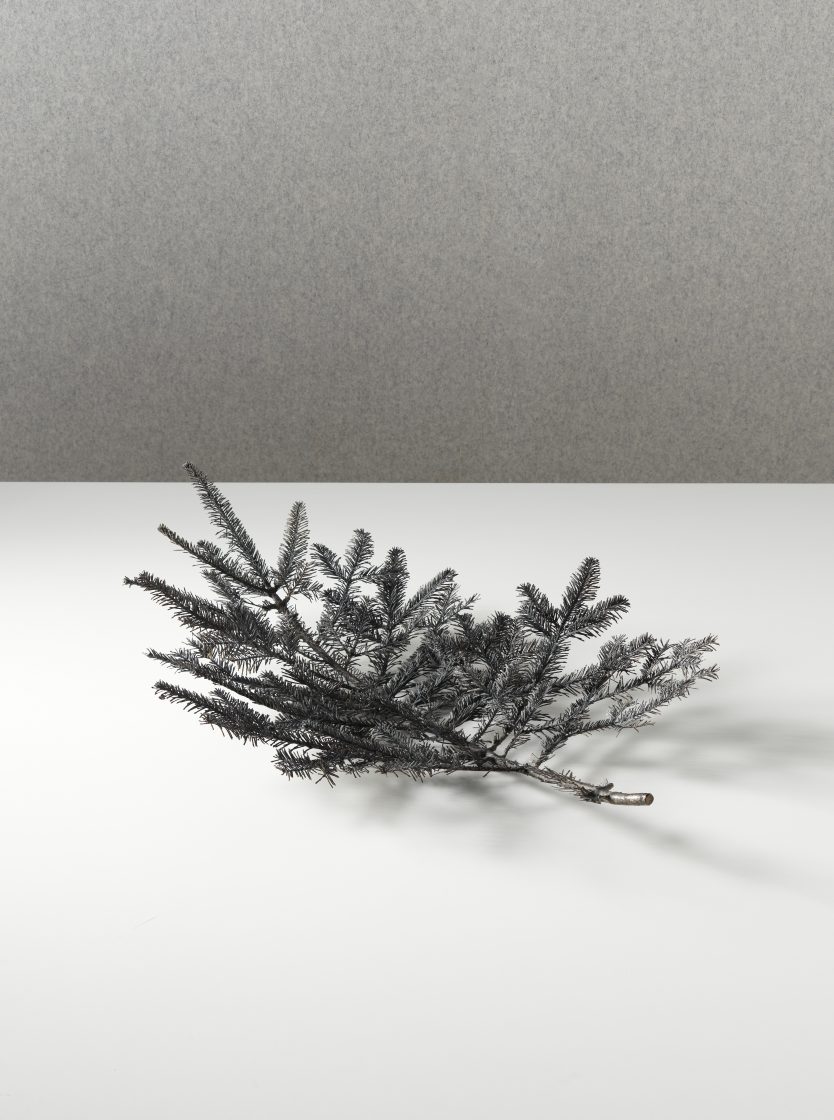 A pine branch, a common plant of the Engadin, is intricately cast in bronze to reveal its complex structure by preserving every detail, indefinitely.
