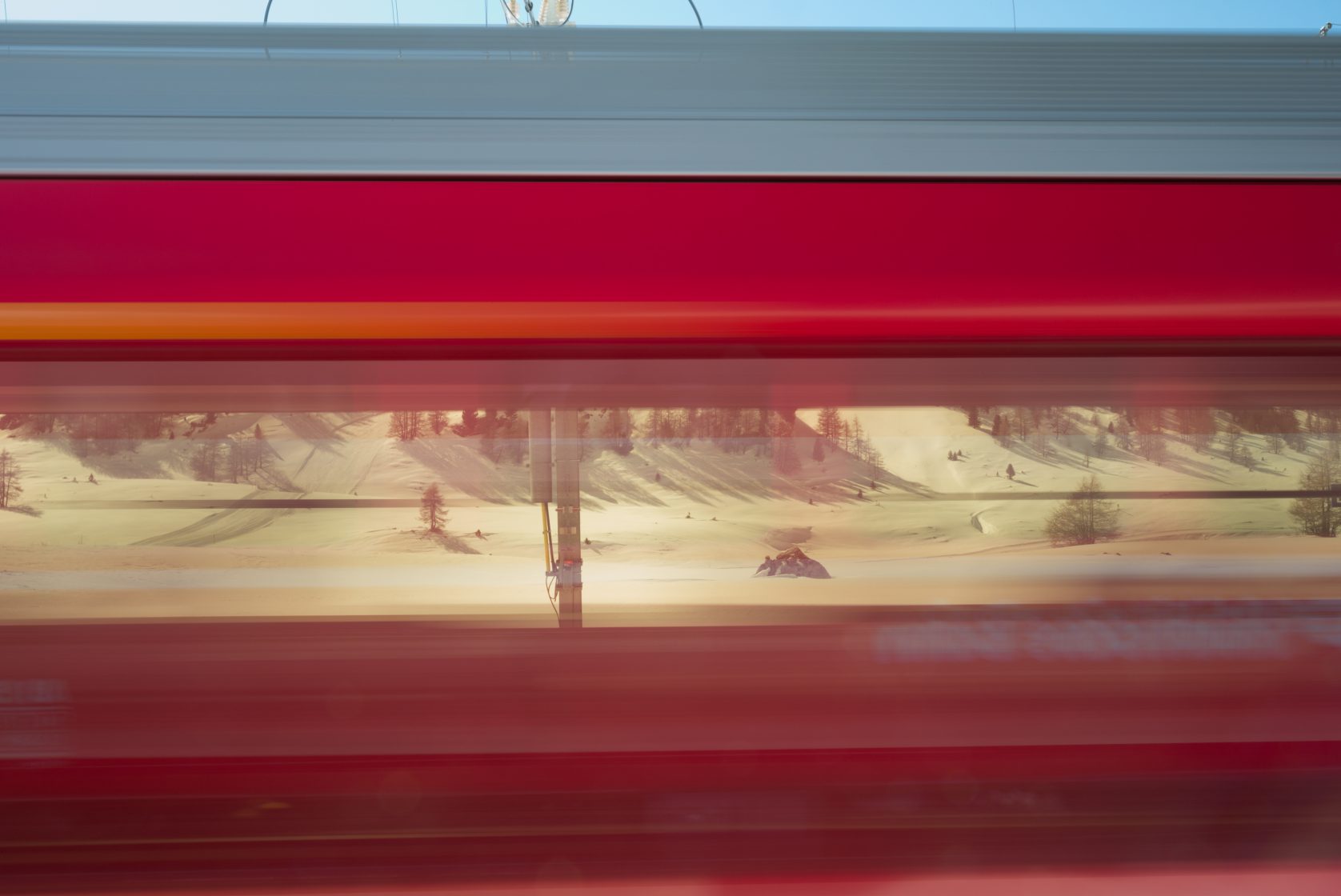 The series ‘Camera in Motion – From Chur to Tirano’ was photographed from a moving train over the course of an entire year, forming an extensive collection of photographs that blur the boundaries between abstract art and landscape photography and explore the landscape along the World Heritage Rhaetian Albula/Bernina Railway line.