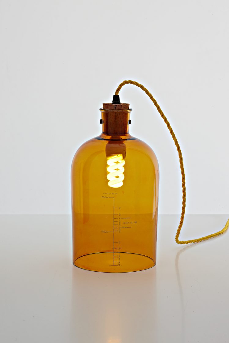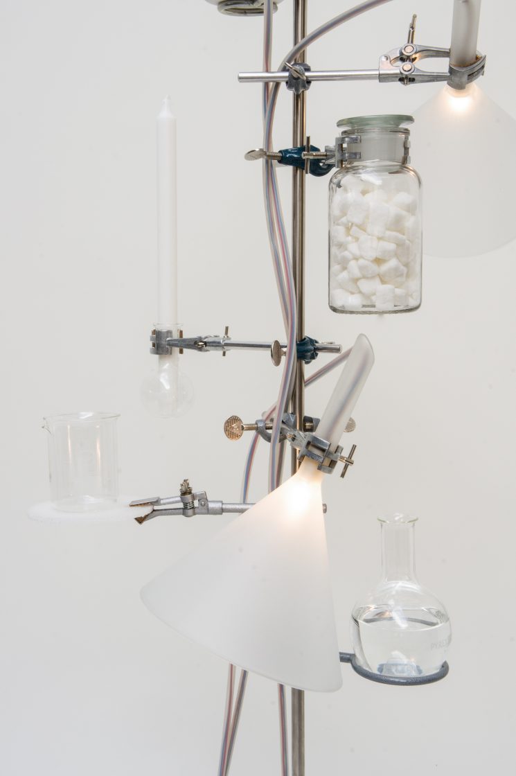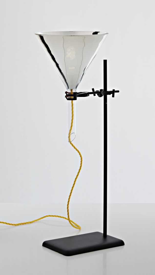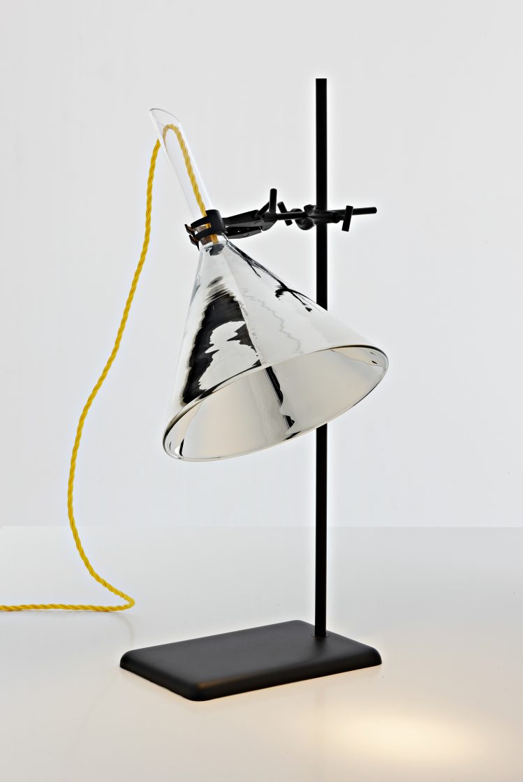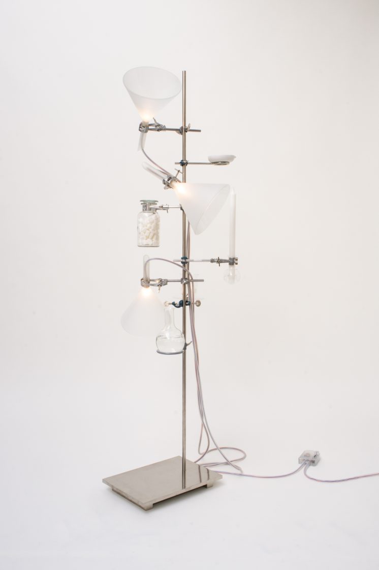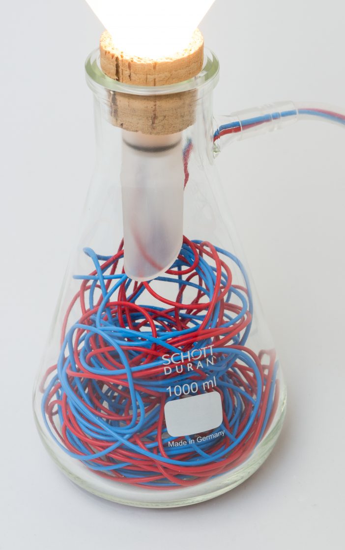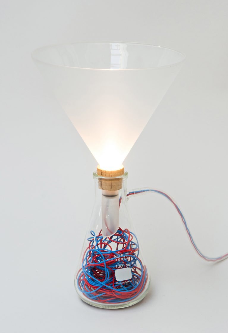 The chemie lighting collection uses familiar chemistry glassware to create a series of sculptural works. The liquids that usually run through the glassware are replaced by blue and red electrical cables, which illuminate the individual vessels.