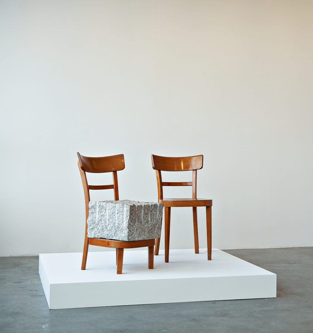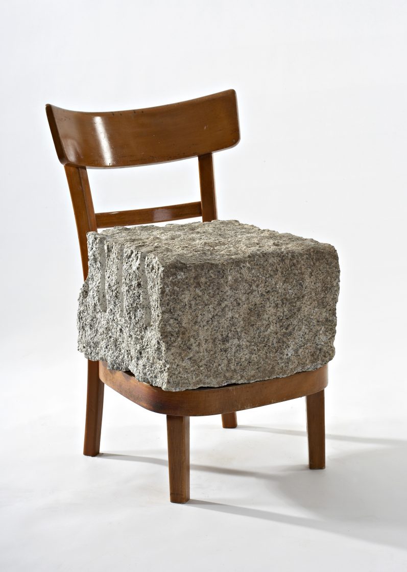 ‘chip on the shoulder’ from the Koeln series, sees the legs sheared away and a rock placed on its seat, maintaining the exact seating height.