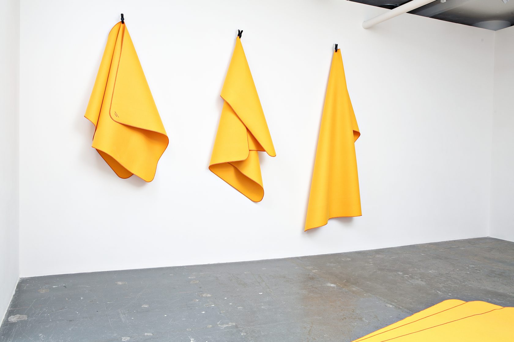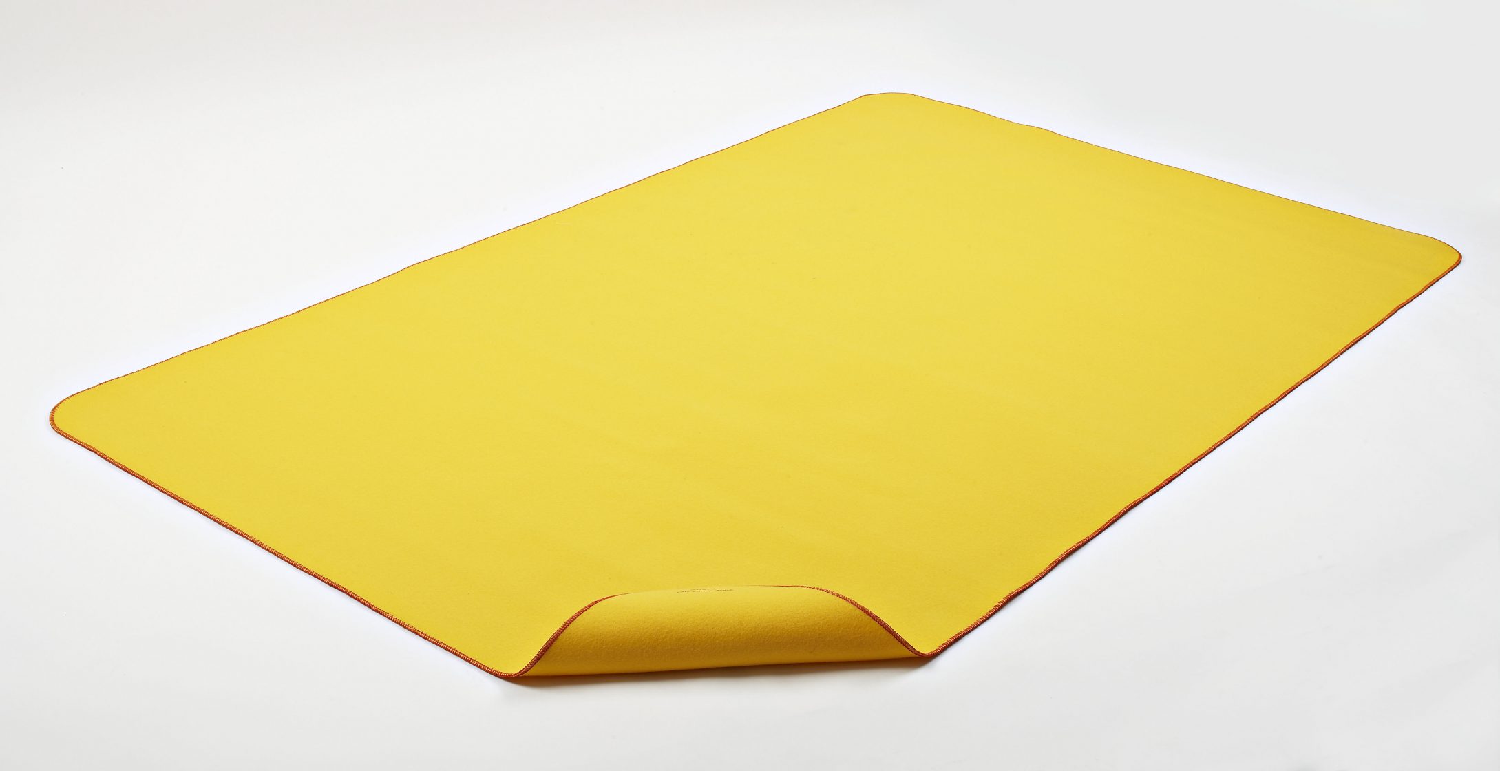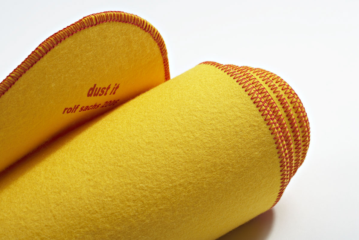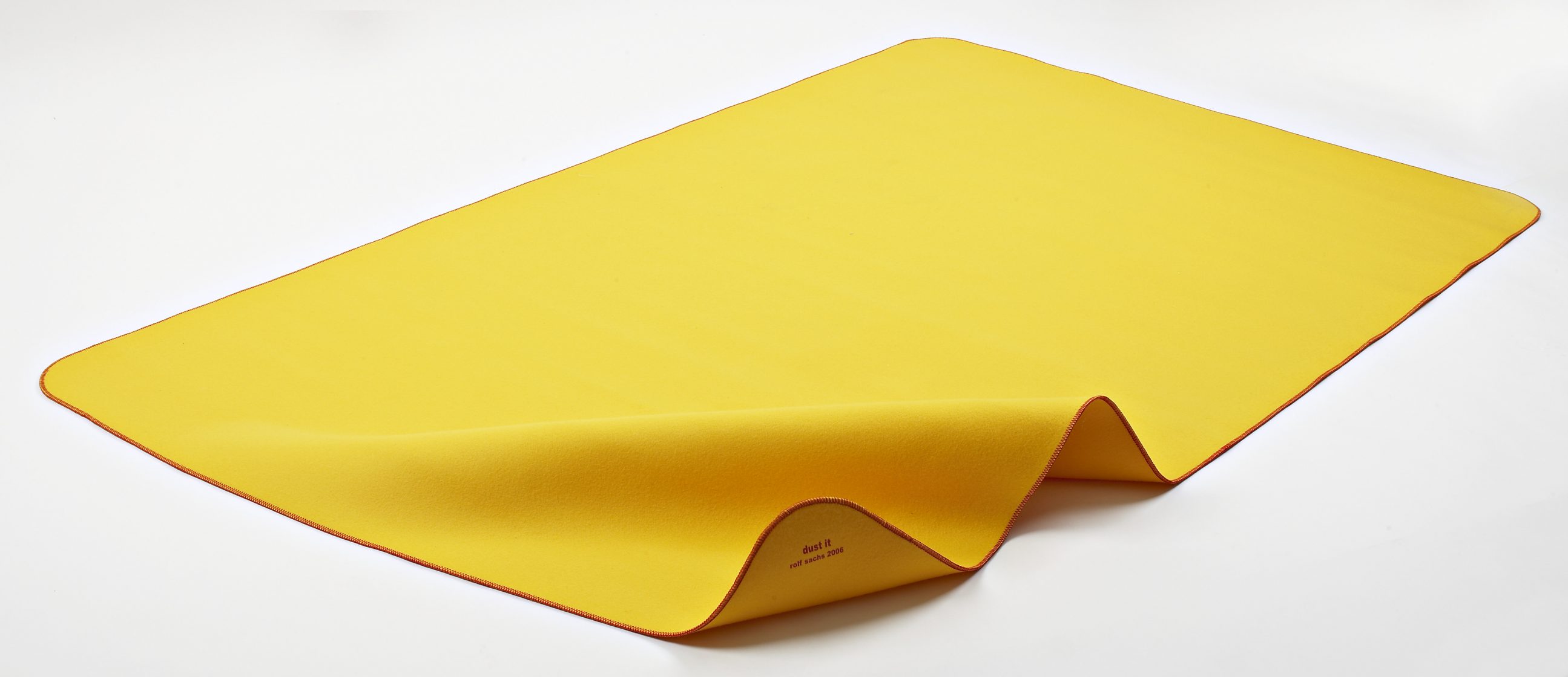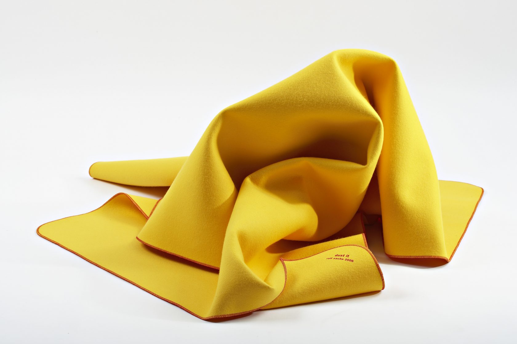 A classic yellow duster is enlarged to form a yellow merino felt rug, with the familiar red stitching around the edges. This playful, signature piece takes this often-overlooked item and removes it from its context, affectionately celebrating its form.