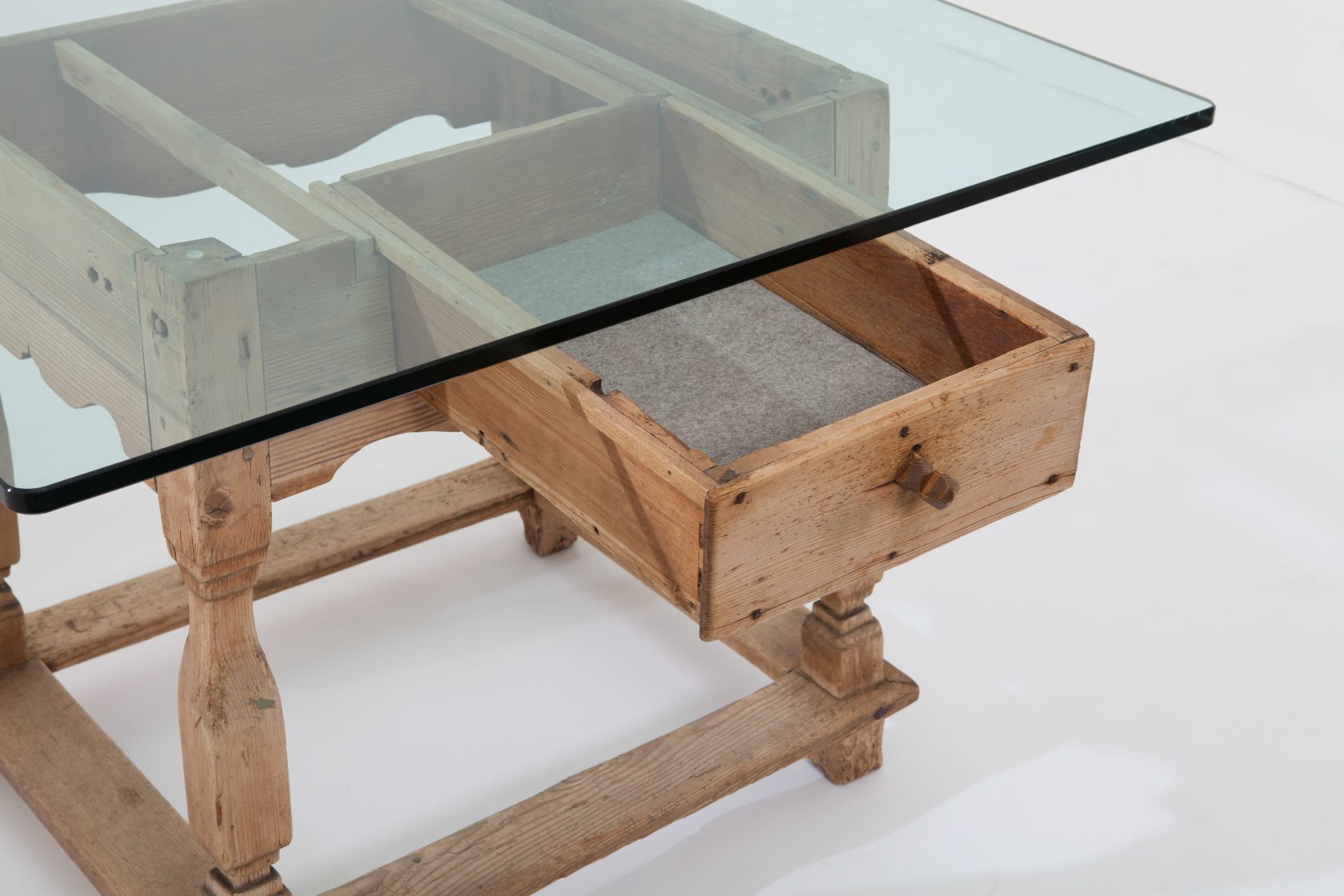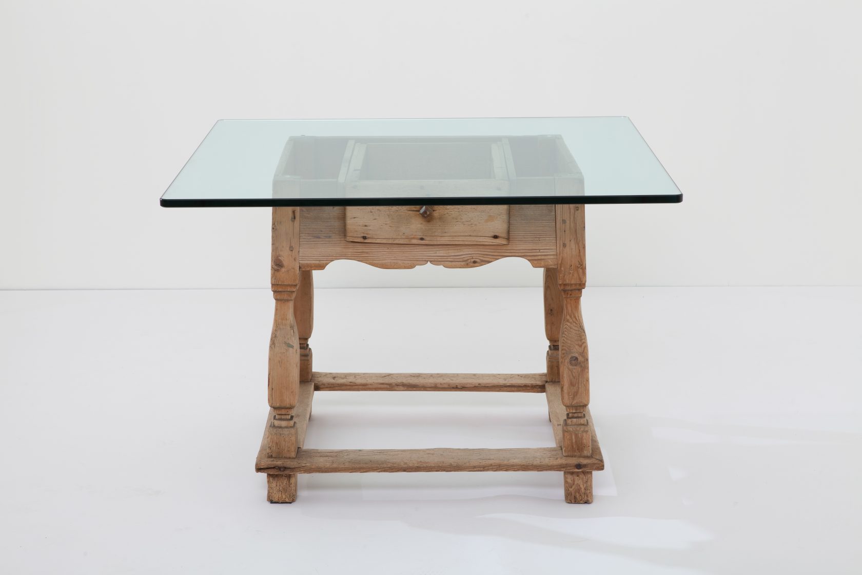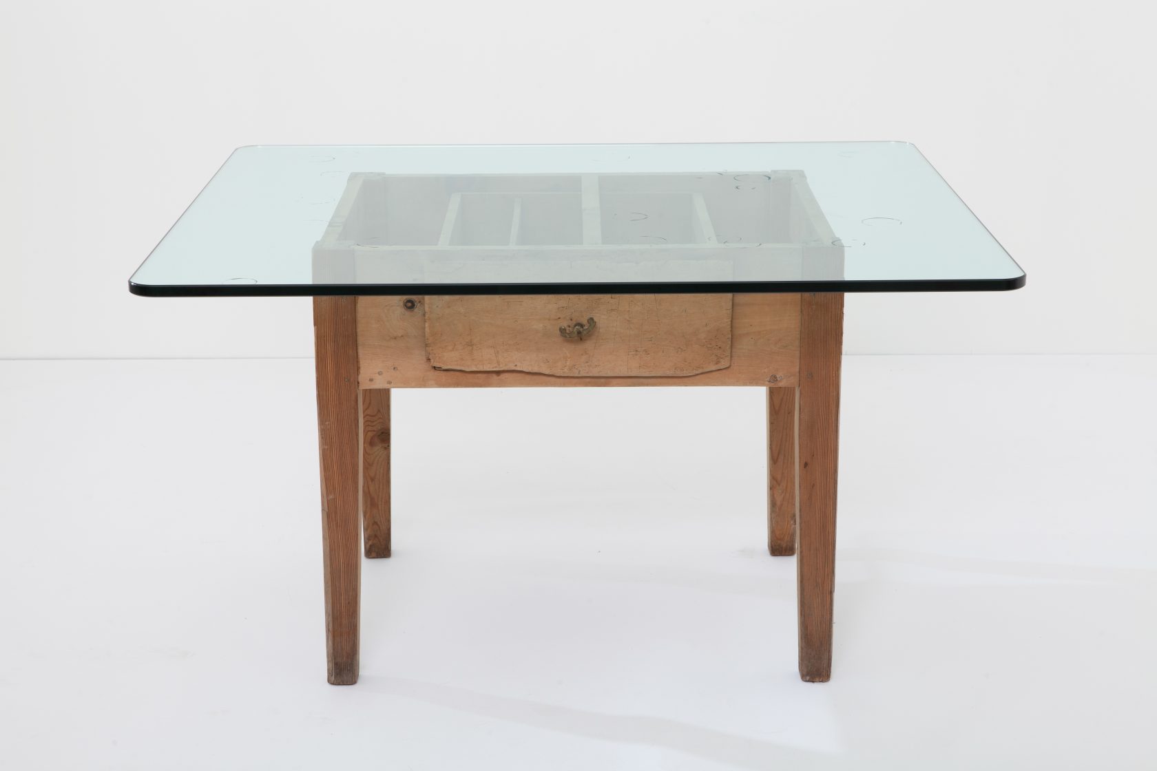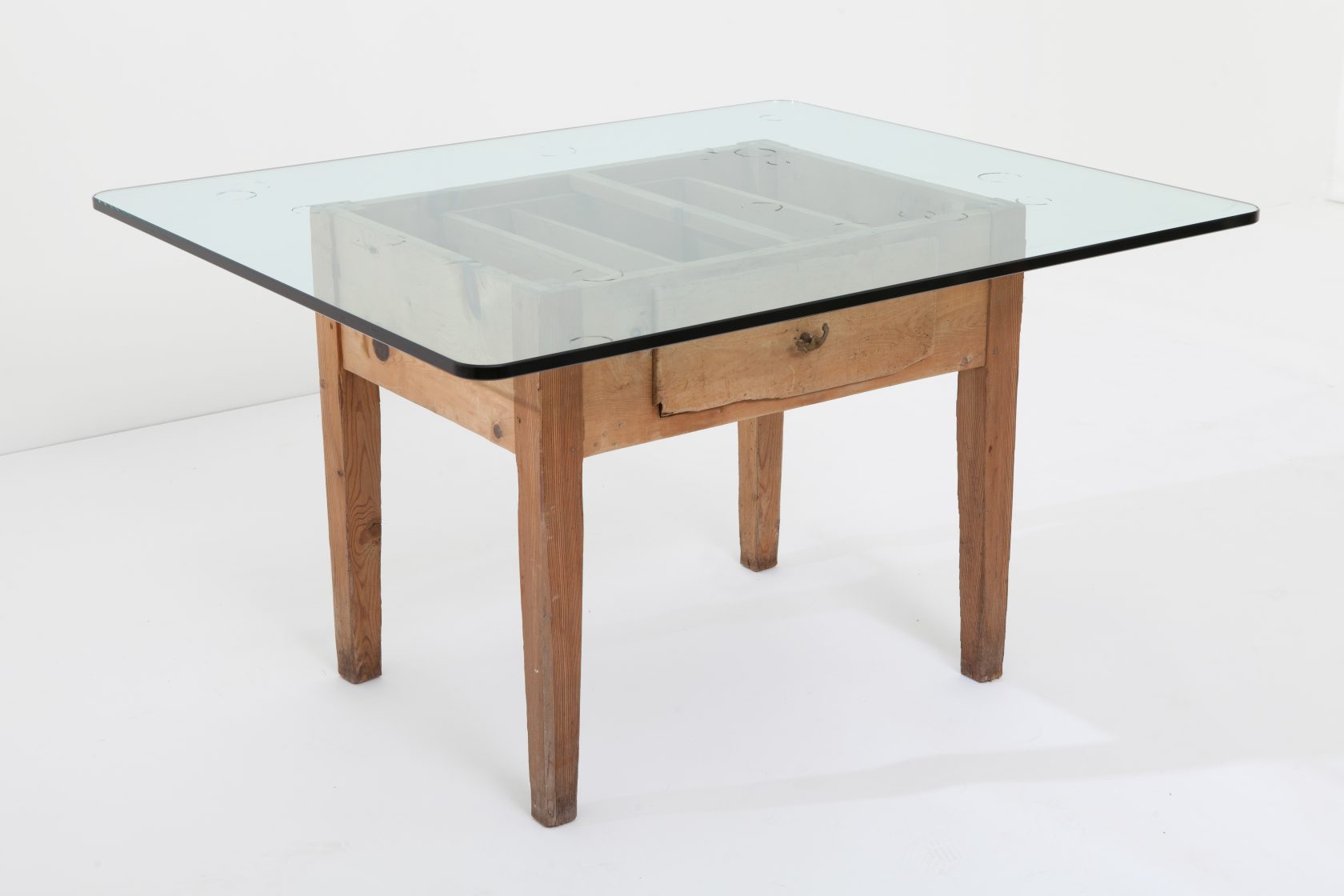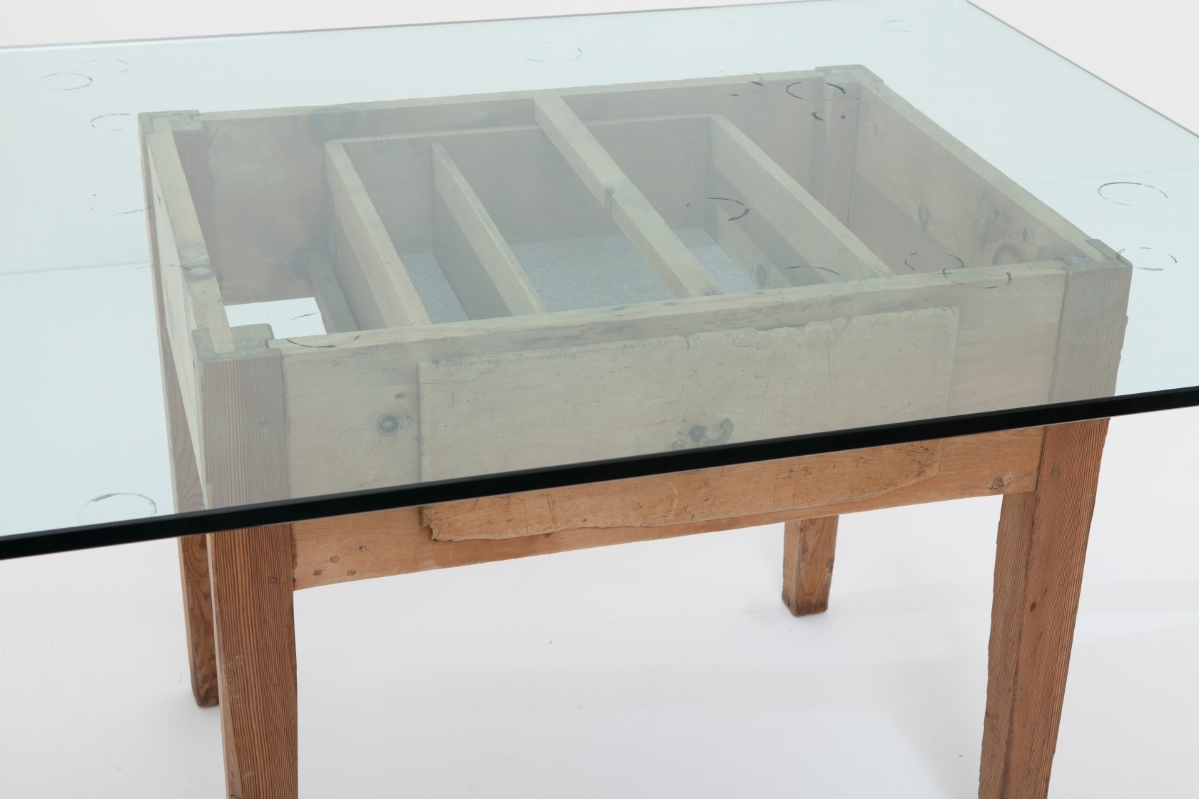 A traditional ‘Bündner’ table is exposed by replacing the table-top with glass, showing its inner structure. Drinking glass ring marks, traces of life and usage, are carefully etched on to the table’s surface.