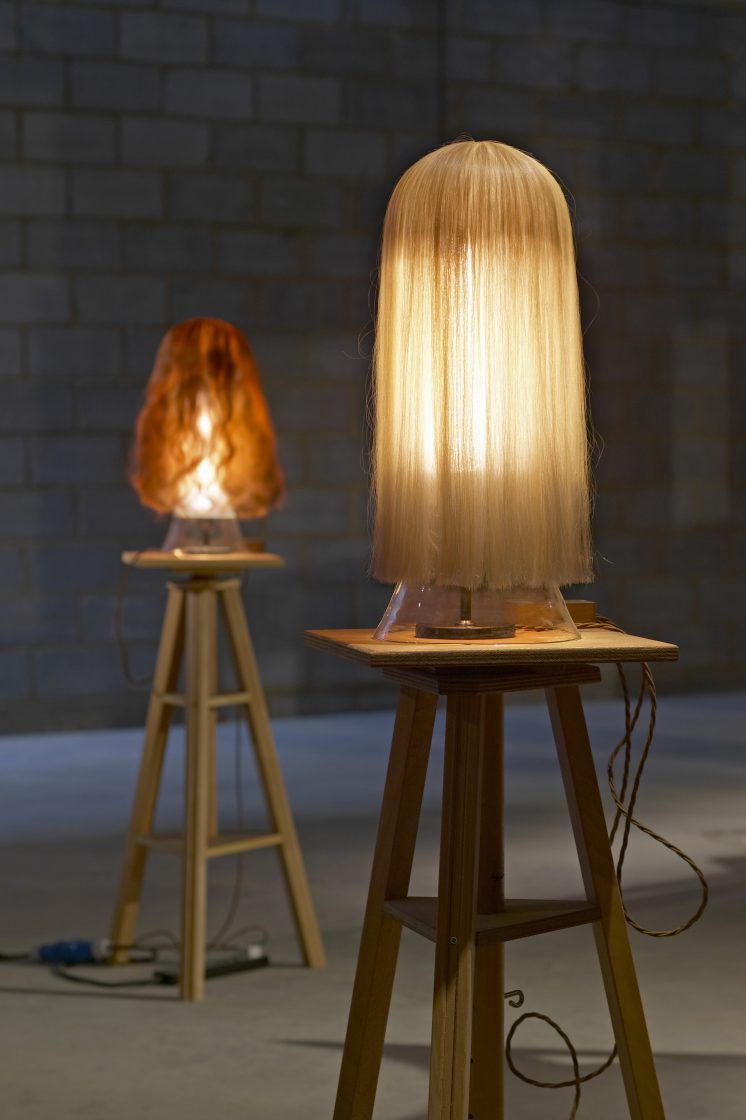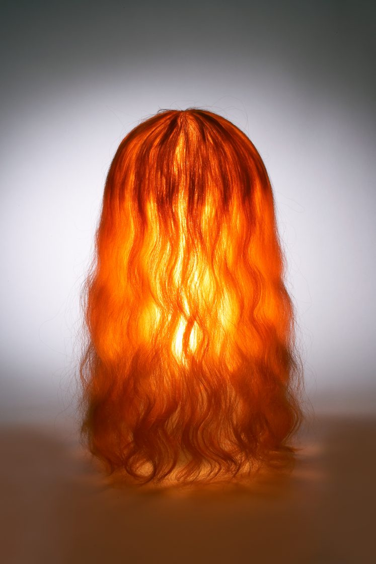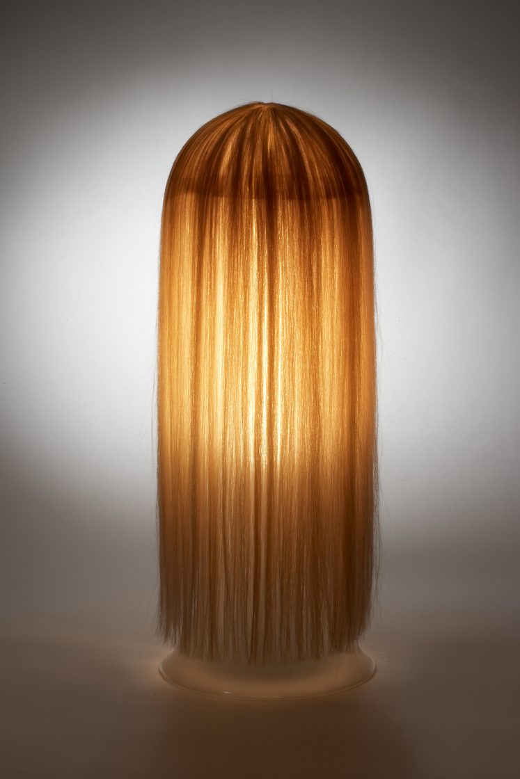 The ‘Elisa’ & ‘ Rita‘ lamp is shaded with a hand woven human hair veil, presenting a faceless objet d’art.