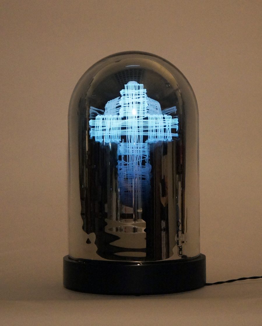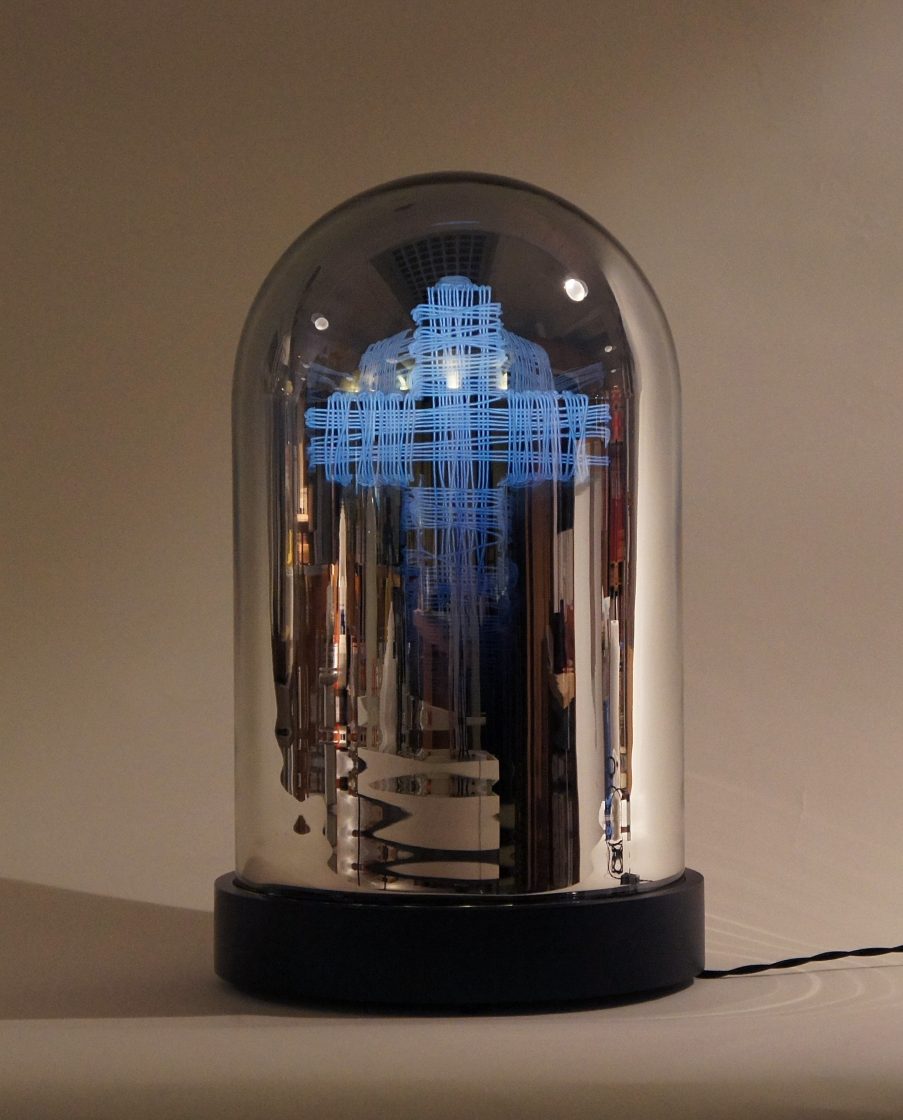 mirrored glass dome, wood, electroluminescent wire, electrics