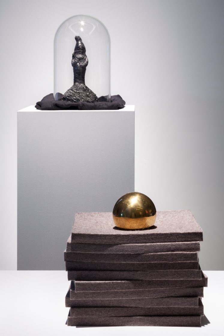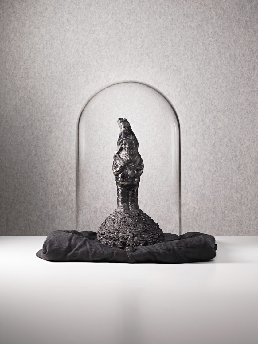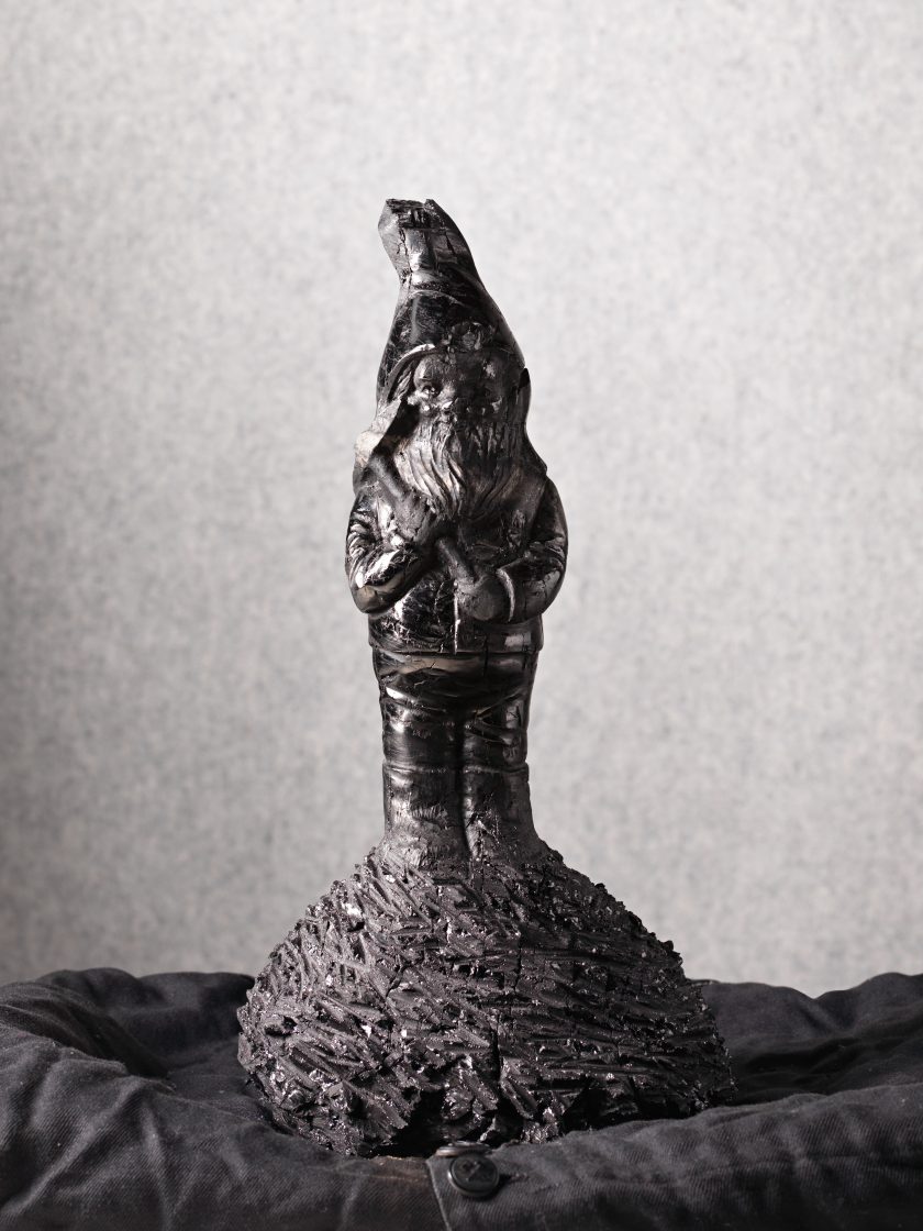 A garden gnome, dressed in miner’s clothing is hand-chiselled from anthracite coal which was especially sourced from the Ibbenbühren Colliery in Germany.