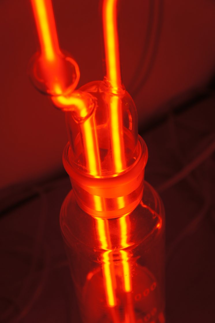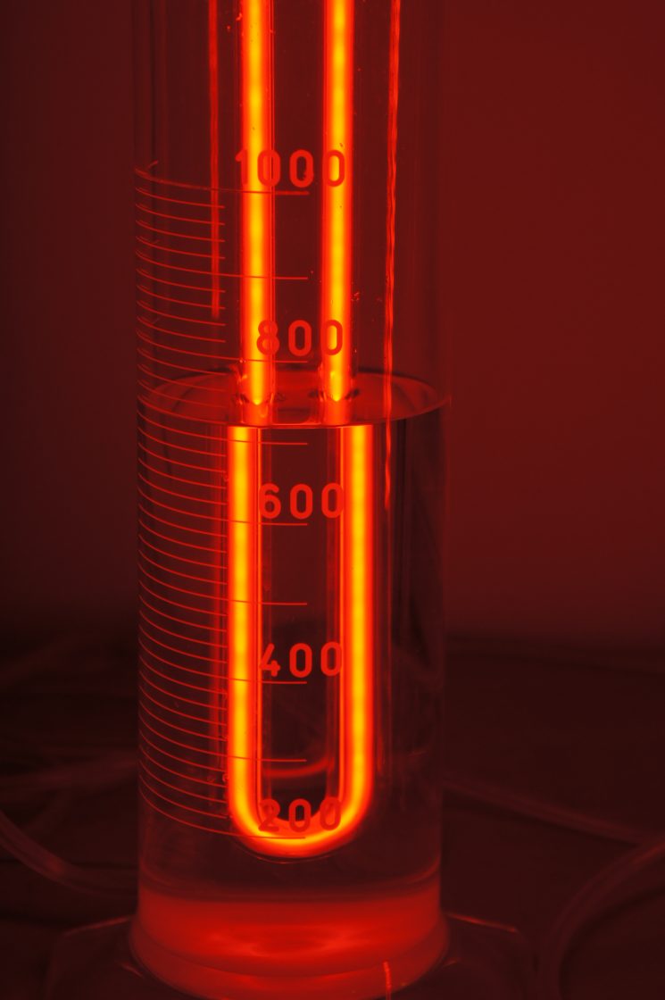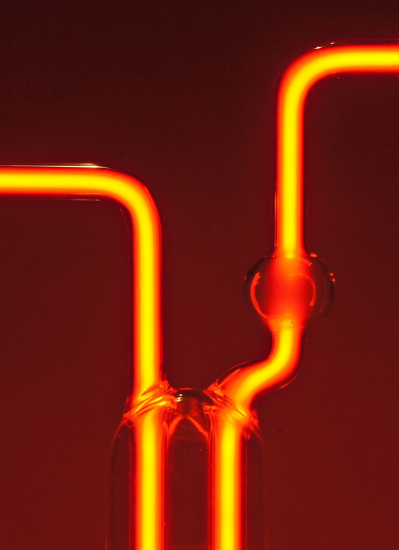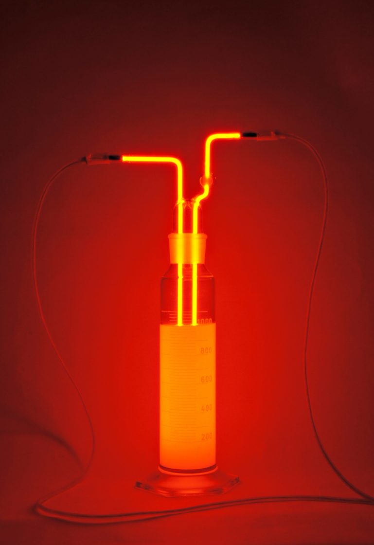 The piece forms part of the neon series where a scientific investigation of the limits of argon and neon are combined with the skills of an expert glassblower, to create works made from scientific glassware that challenge our preconceptions of what the gases are capable of.