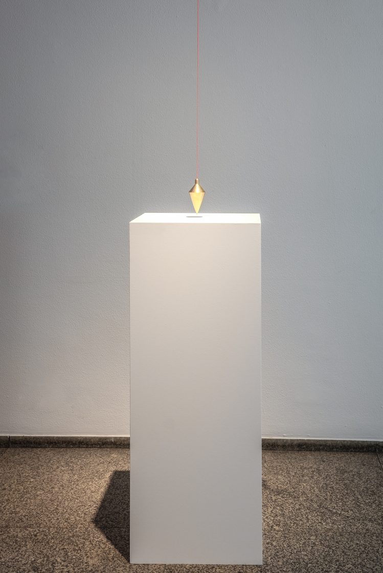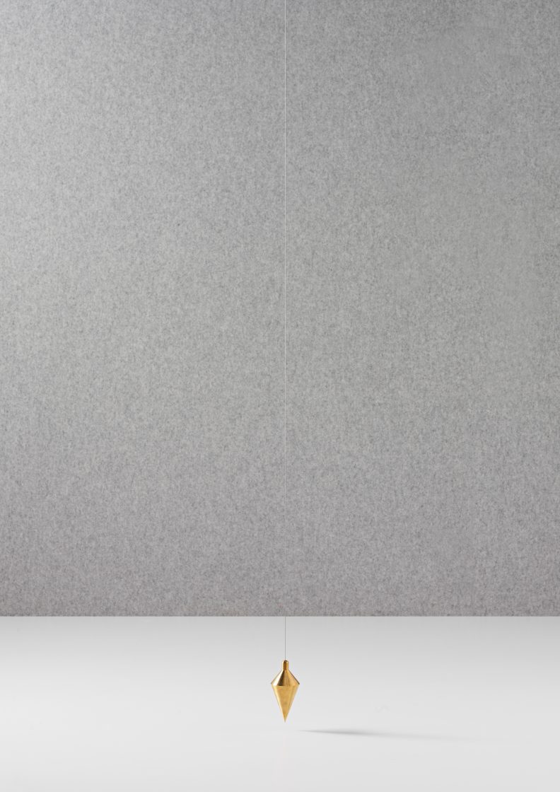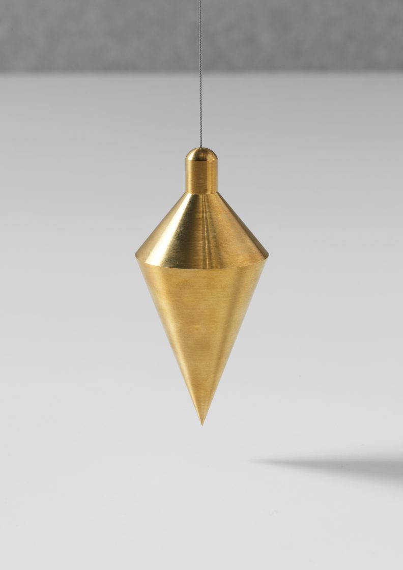An oversized plumb line, a tool usually used to determine a perfect vertical line, is suspended from a great height as an interpretation of German precision.