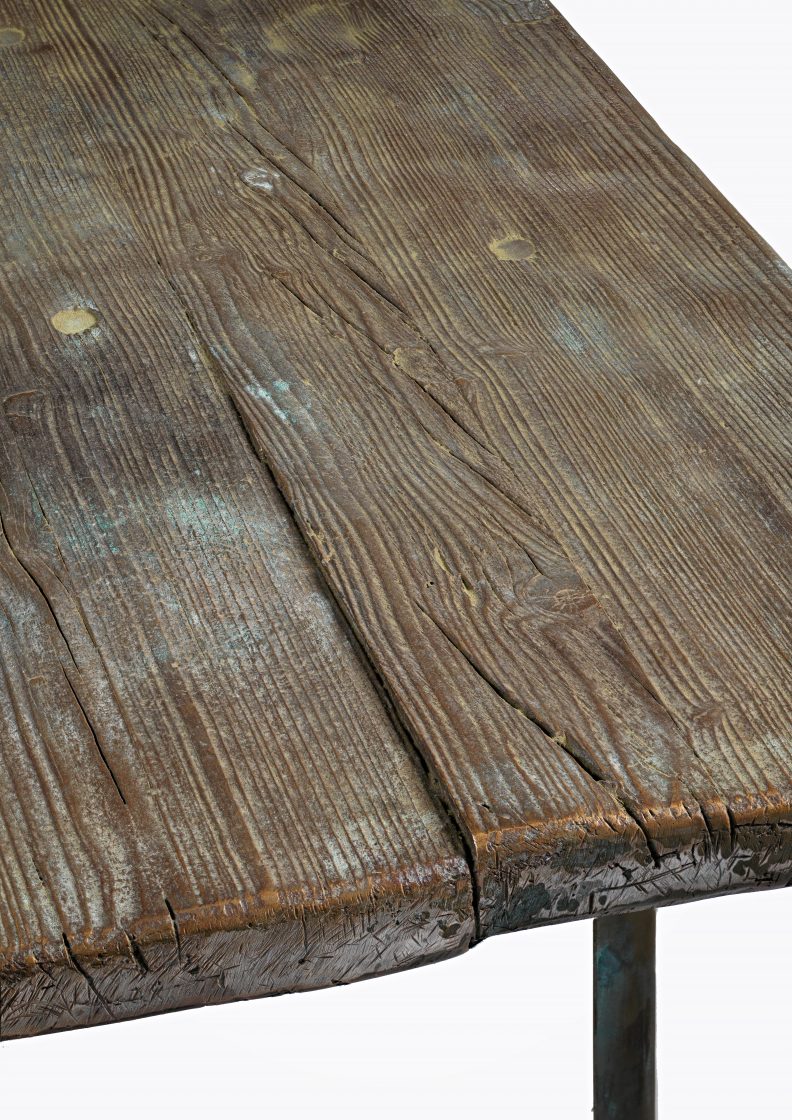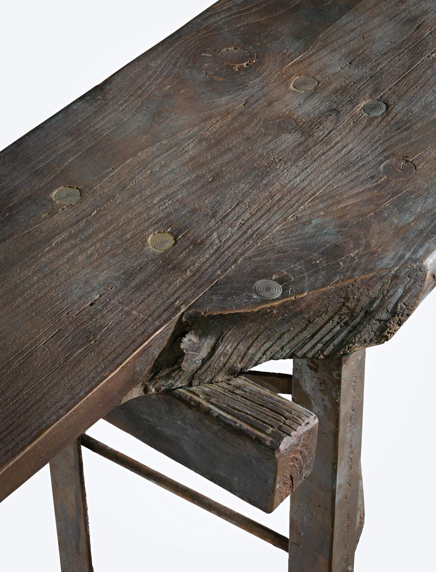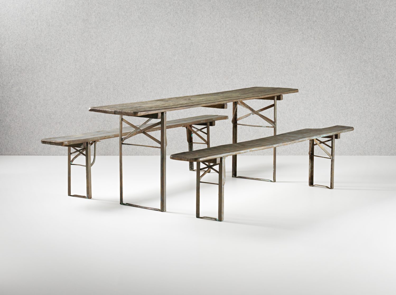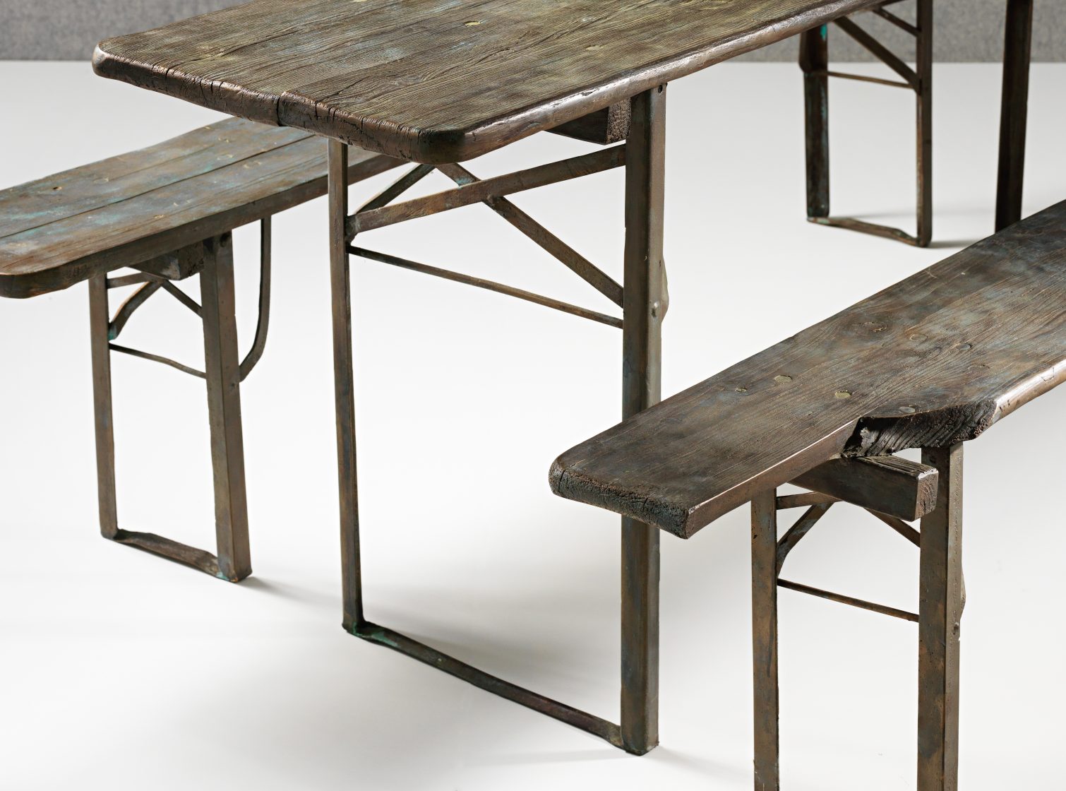 A bronze beer-garden table and benches evokes the social traditions of German culture while celebrating this utilitarian style of furniture.