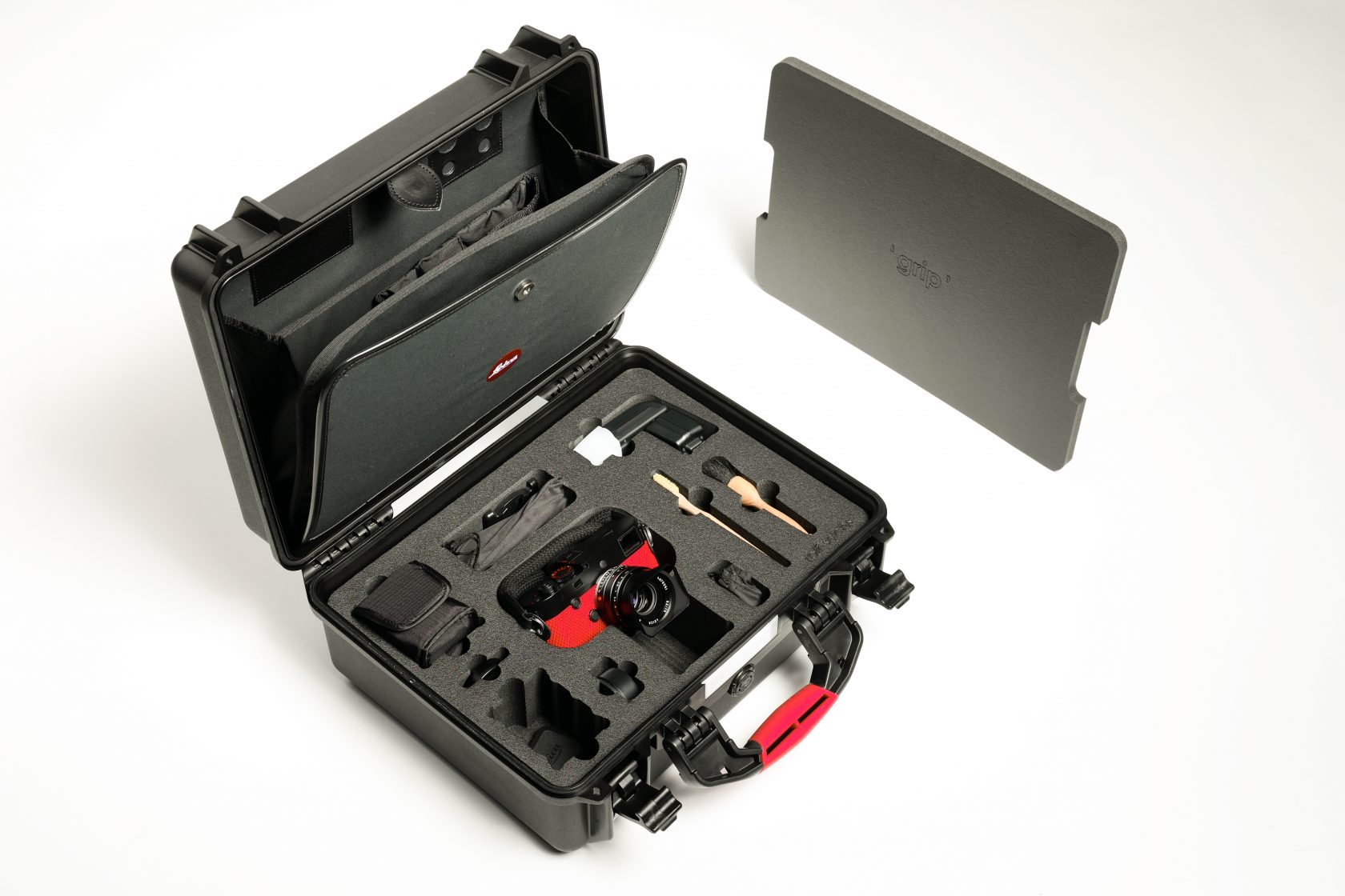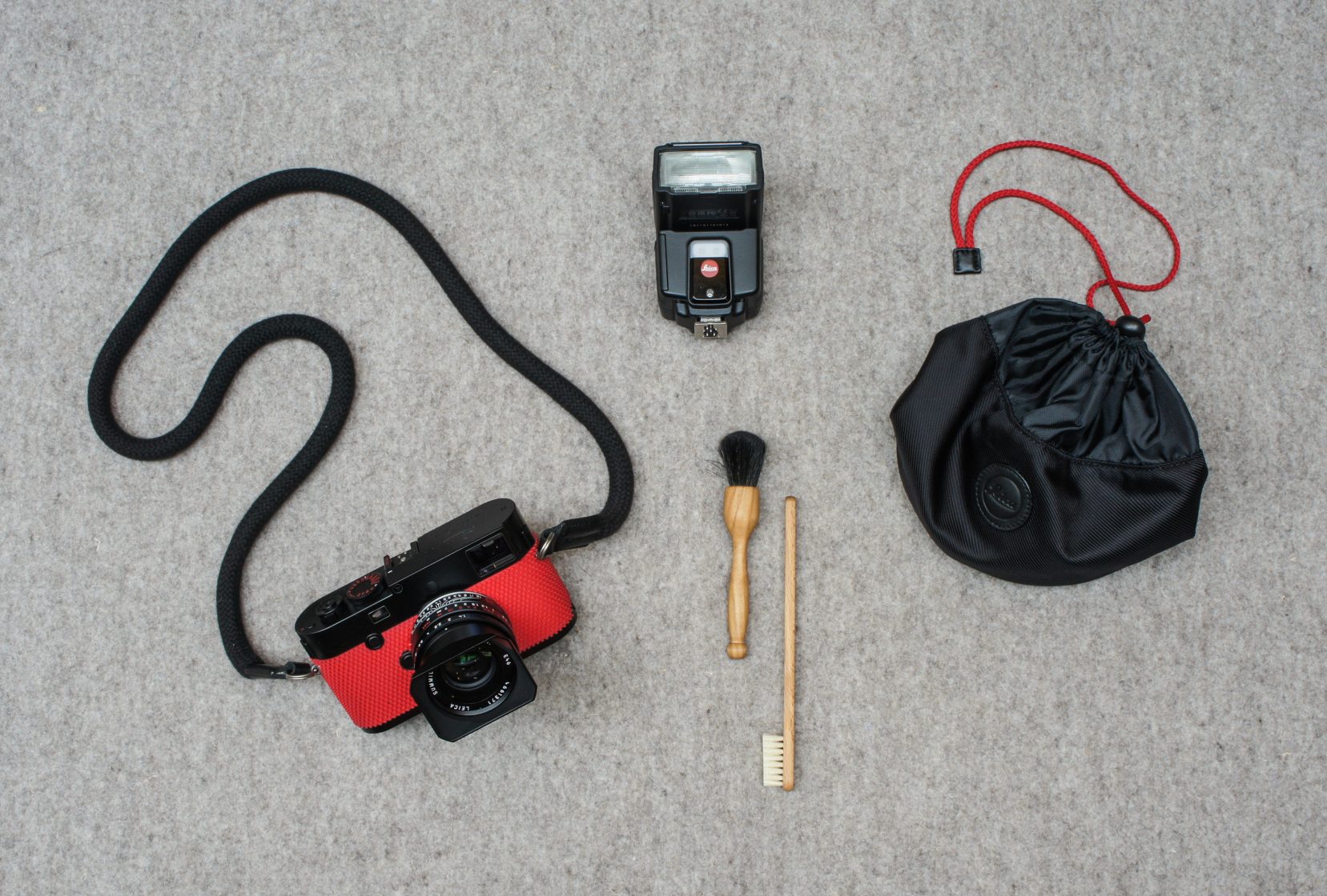 The Leica M-P ‘grip’ by Rolf Sachs set comes in a black case containing the camera, the lens, a Leica SF 40 flash, a thick woven black cotton shoulder strap and some unusual accessories such as a wooden toothbrush to clean the specialist rubber and a natural goat brush “Staubpinsel“ to clean the lens.