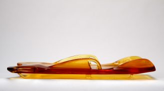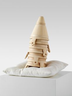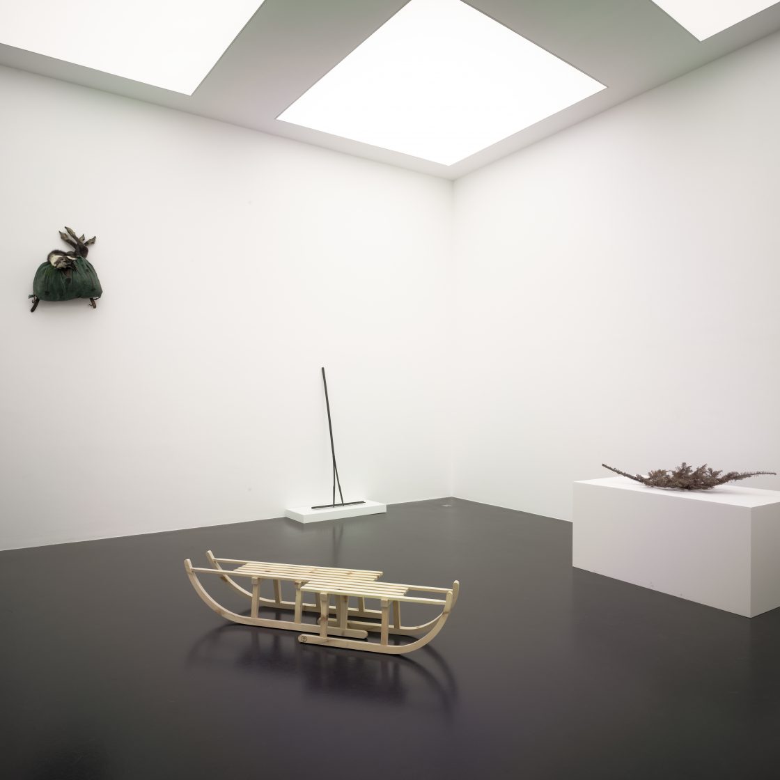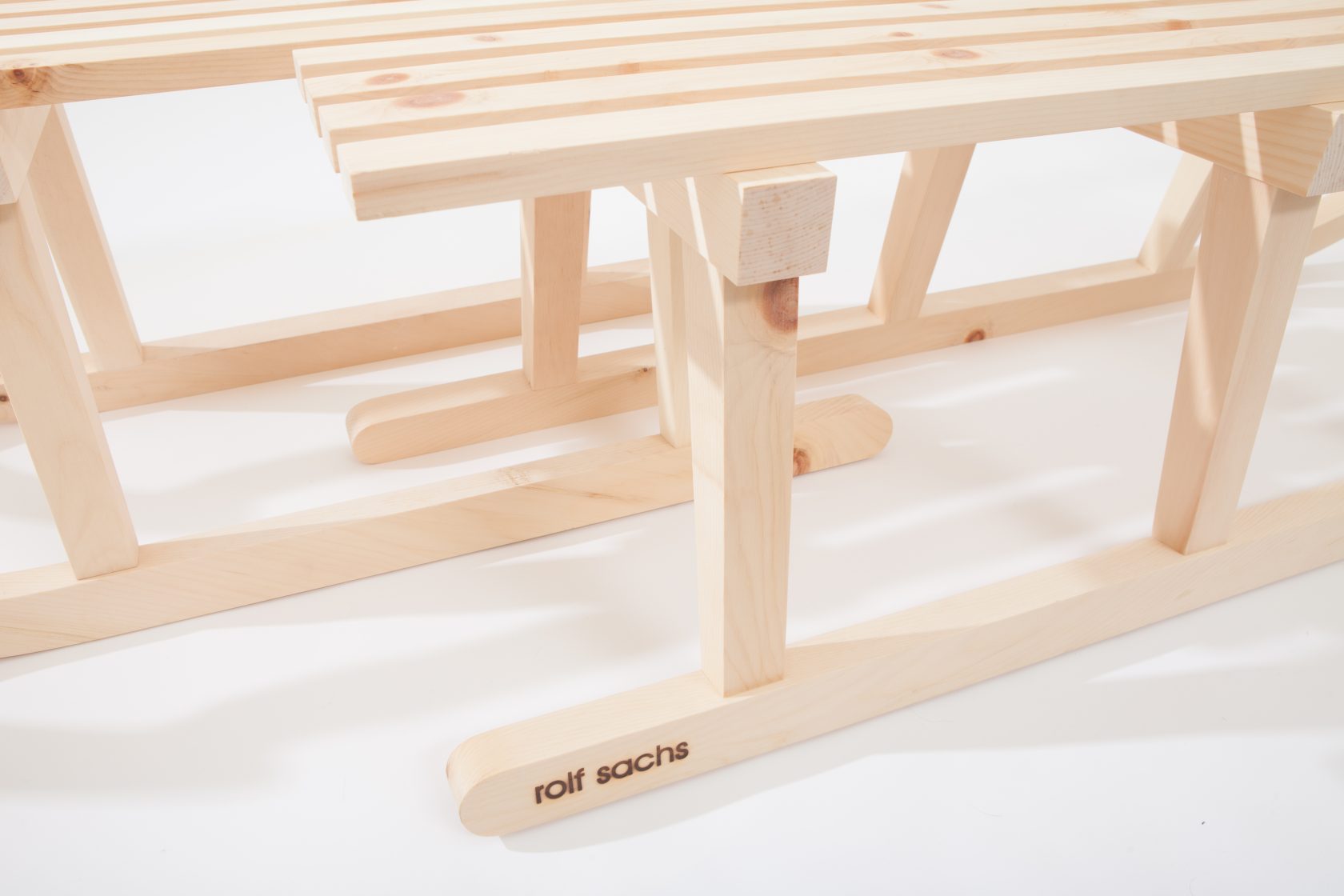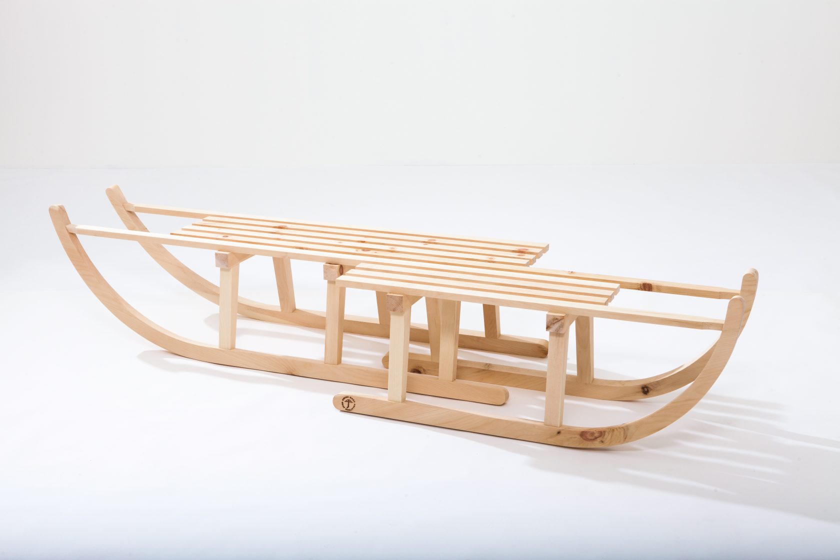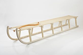 This playful piece fuses two ‘Davoser’ sledges, intertwining them to create a surreal fusion of two ‘characters’. It was produced by the renowned Swiss sled and luge-maker, Graf Schlitten in Sulgen, using traditional wood-bending techniques.