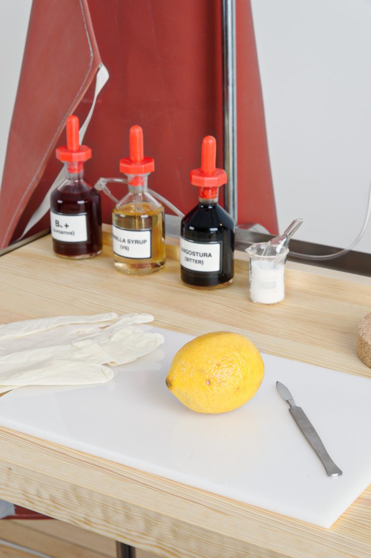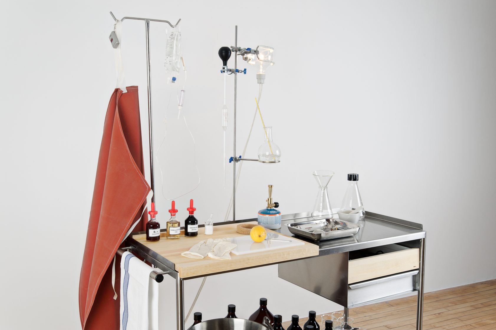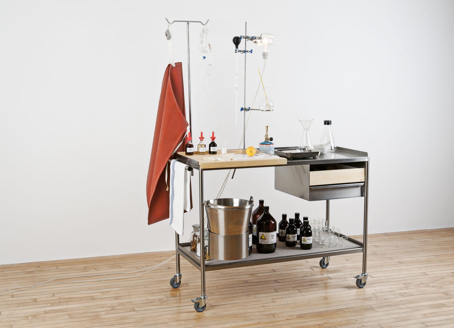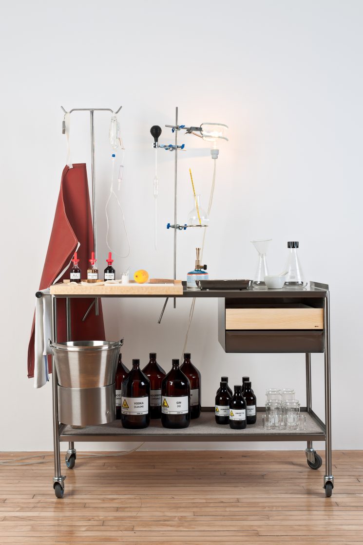 A playful and ironic homage to the art of cocktail making, this portable bar turns the process into a scientific pursuit, with custom-designed labels, a breathalyser, a Bunsen burner, latex gloves, a scalpel for dissecting fruit and measuring flasks to ensure absolute accuracy. Intoxi-lab was made for the event ‘Paint Me a Drink‘ at 20 Hoxton Square, showcasing established and emerging artists, with original commissioned artwork inspired by a particular drink or cocktail of their choice.