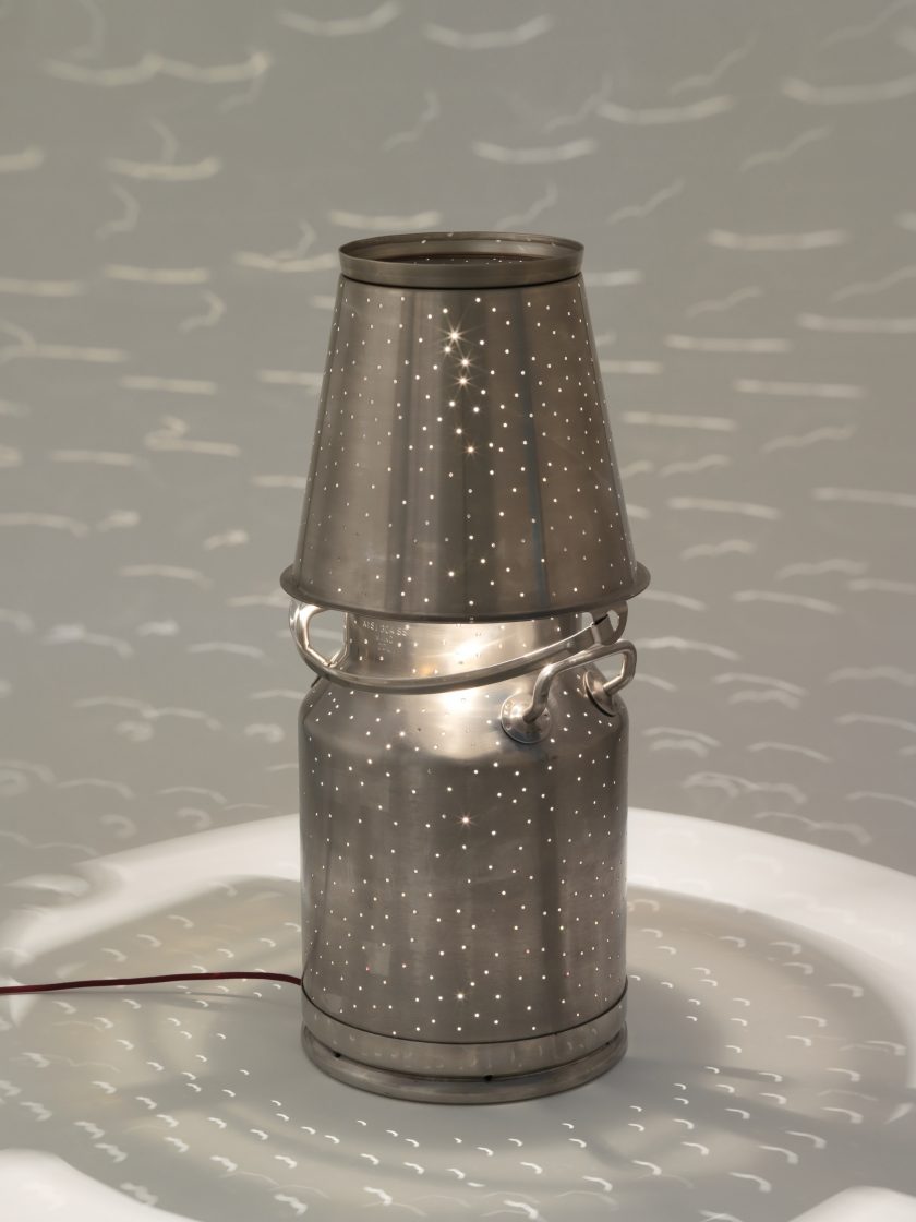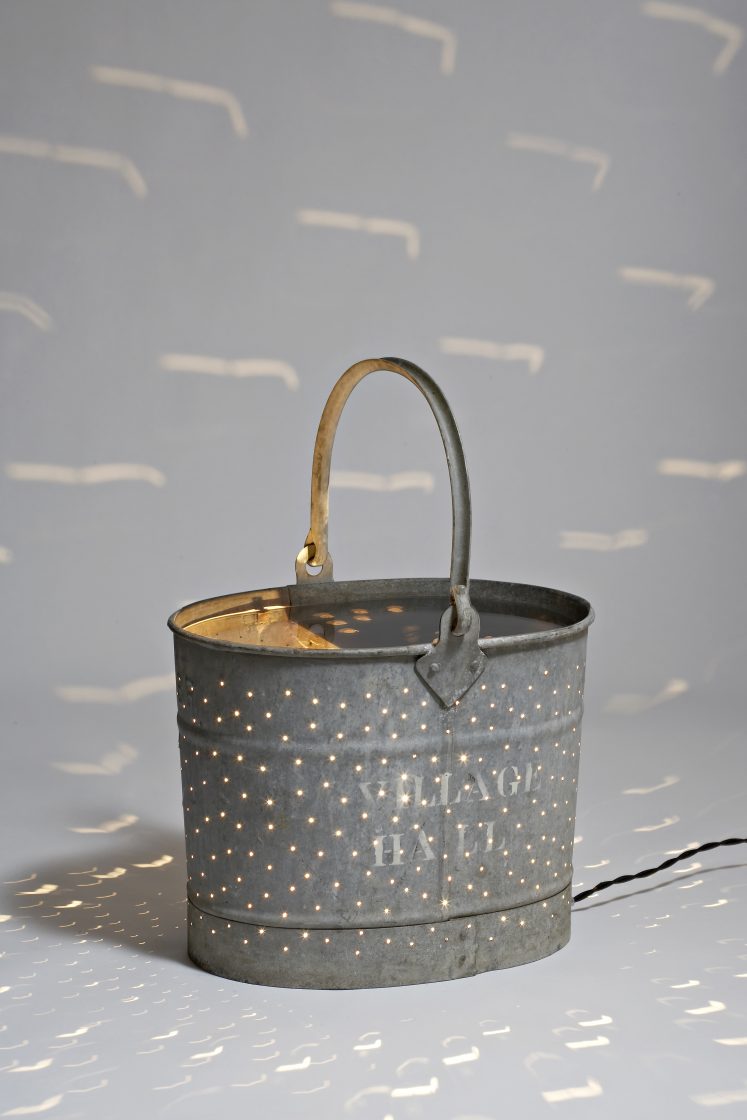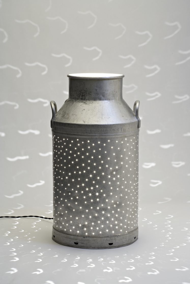 The pouring light series are reworked vintage milk churns, buckets, watering cans, or other vessels. The light leaks through the perforations creating a ‘pin-hole’ camera effect, pouring light on to every surface.