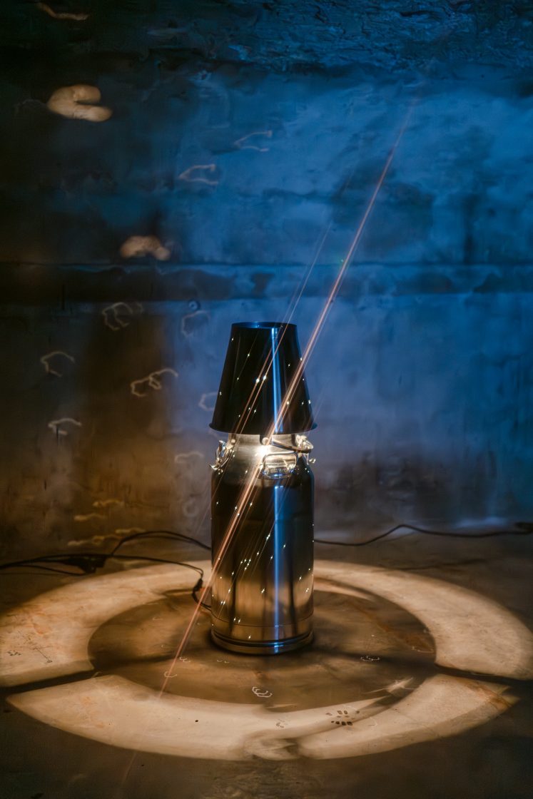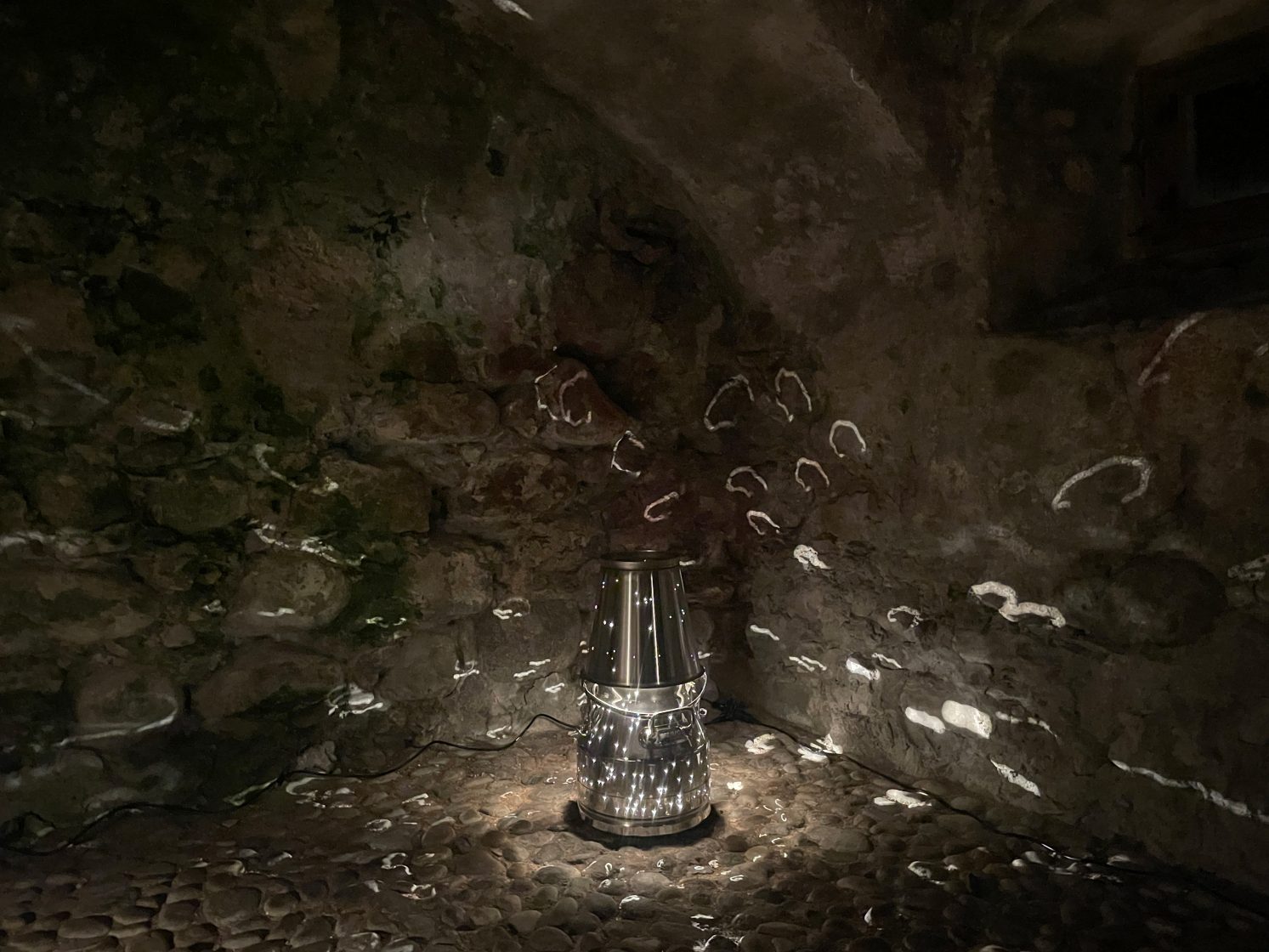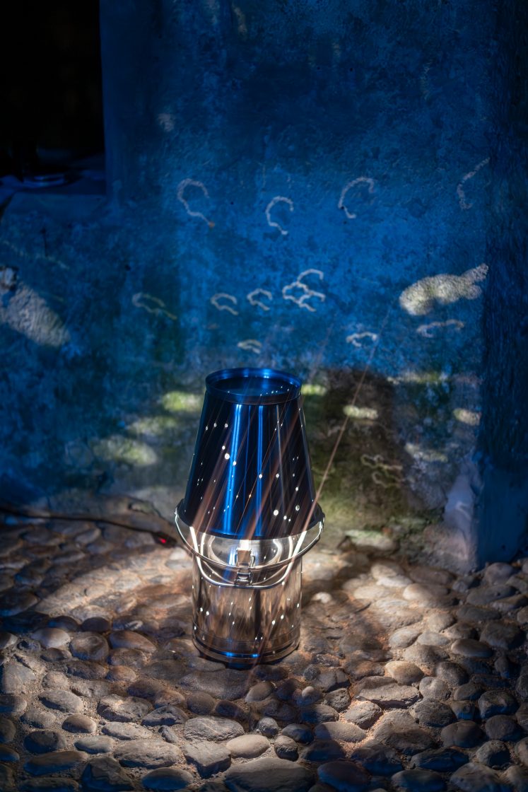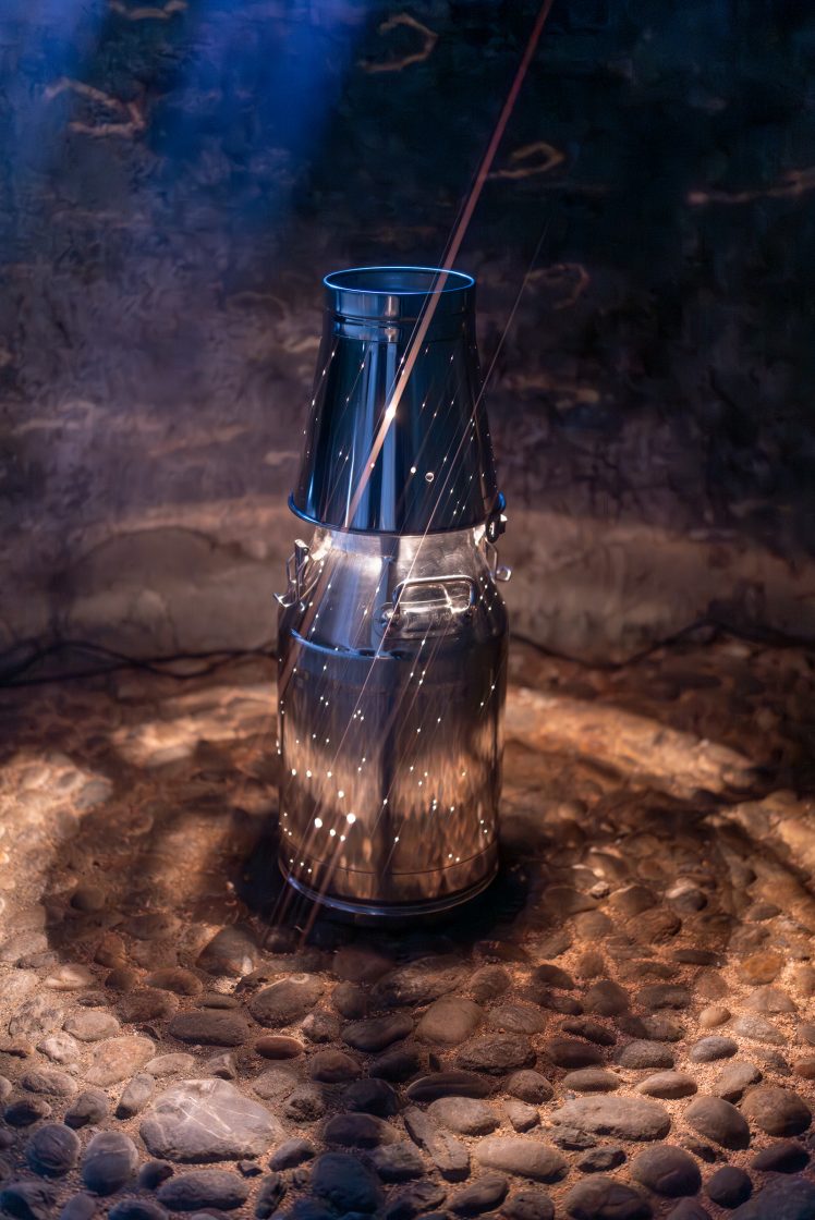 The Pouring Lights are made by coupling drilled steel milking cans and buckets that project light. Light projected from the holes creates the zodiac signs of famous artist couples. The star signs of Sophie Taeuber Arp & Hans Arp, Charles and Ray Eames, Jasper Johns & Robert Rauschenberg, Georgia O’Keeffe & Alfred Stieglitz, and Niki de Saint Phalle & Jean Tinguely transformed the cellar of Stalla Madulain into a whimsical cavern.