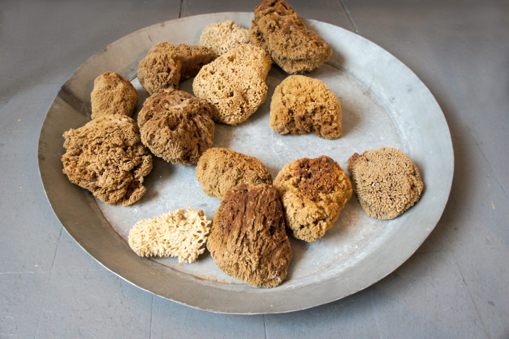 Galvanized steel trough and watering can, natural sponges