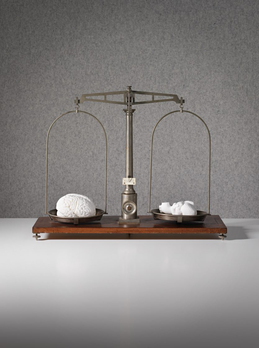 A human heart and brain, hand-carved from marble, sit in perfect balance on a set of vintage weighing scales. In ‘Sehnsucht’ (yearning) logic, emotion and memory merge, illustrating the need for balance between the ‘head’ and the ‘heart’.