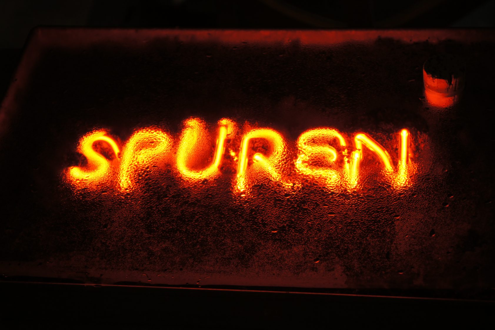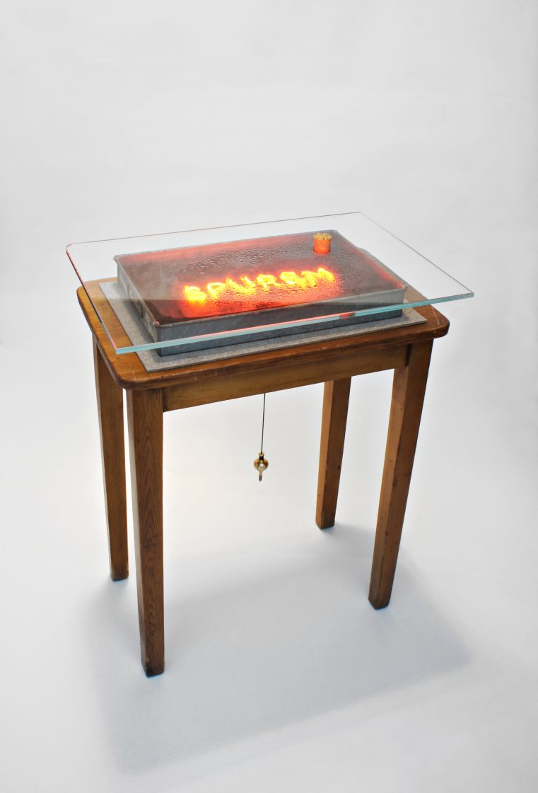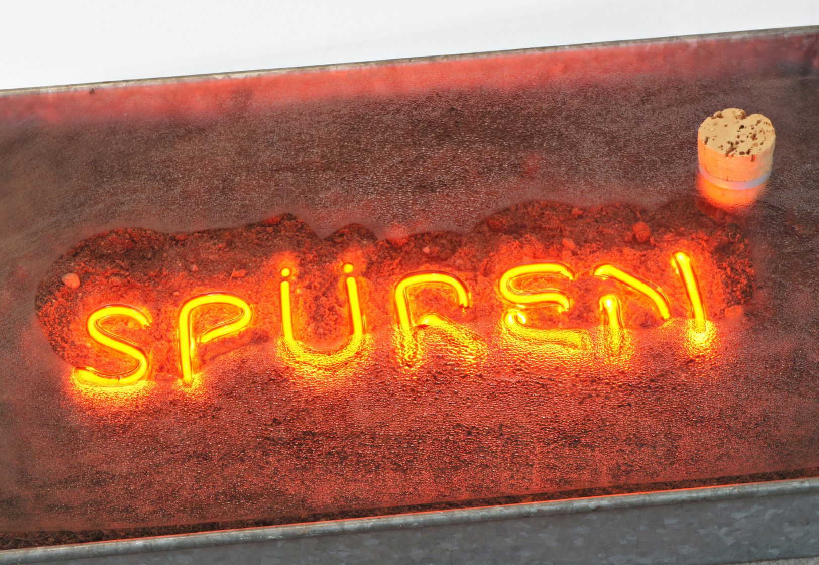 ‘Spüren’ – the German term for sensory perception – is a wooden console table filled with earth and neon. A cork sits in the glass, and once removed one can touch the earth – offering a purely tactile experience, while freeing the water vapour within.