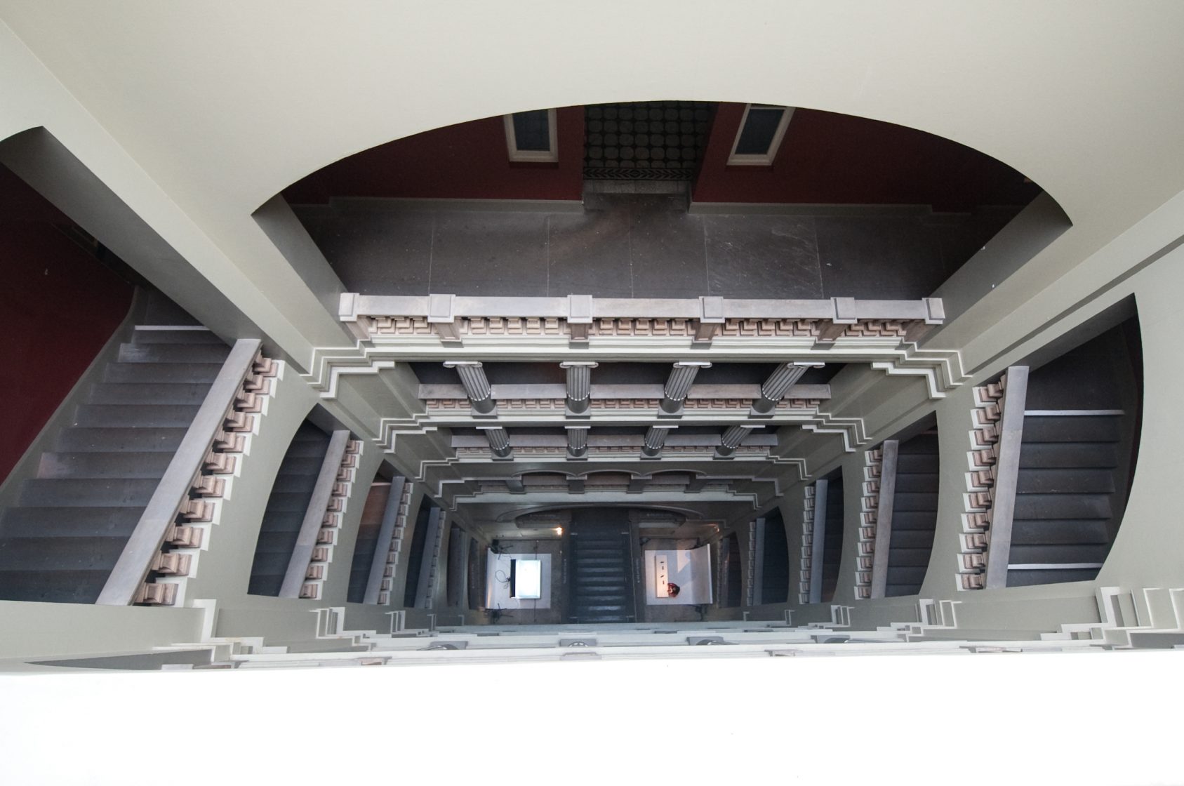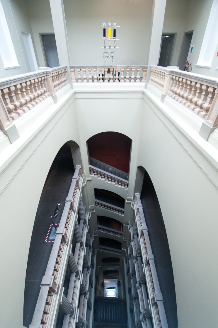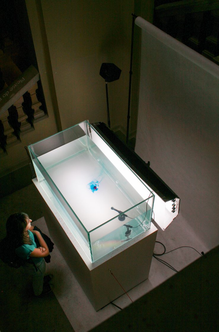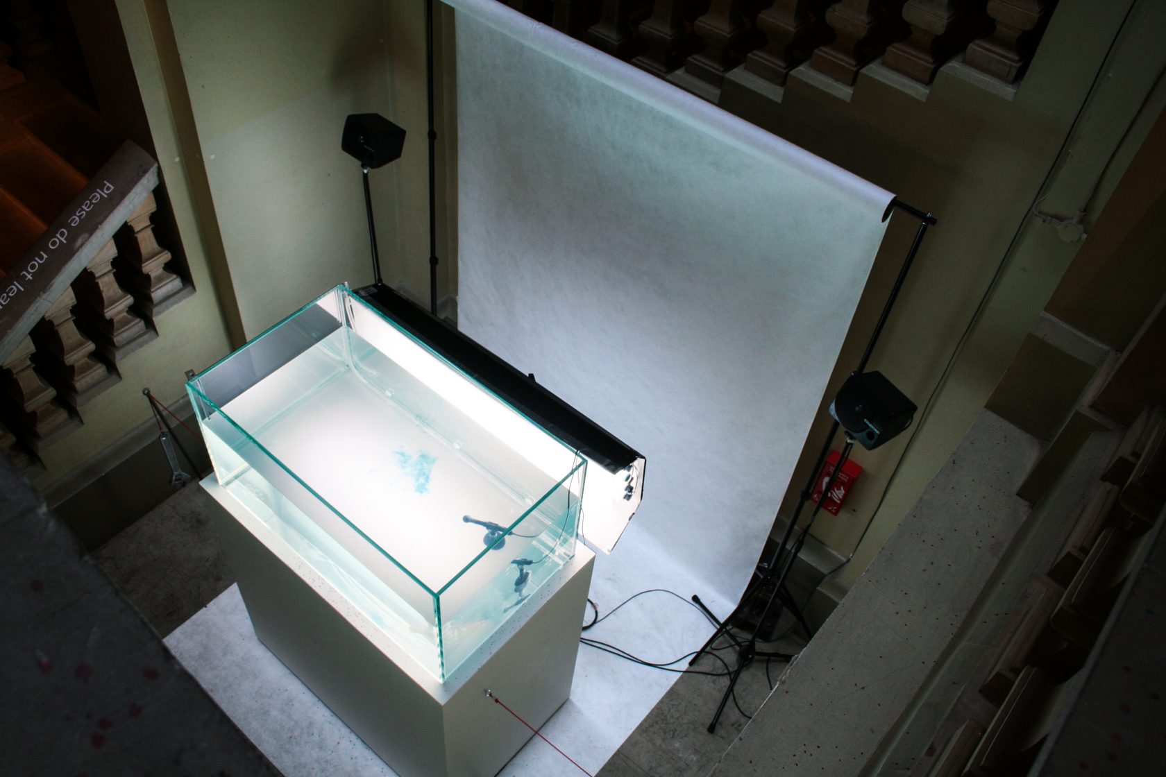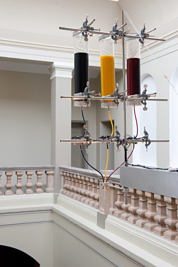 Individual drops of three primary-coloured inks are released from the great height of the V&A’s Henry Cole Wing Grand Staircase, in measured intervals, from IV drip bags and fountain pens, exploiting the soaring height of the ornate space, which was open to the public for the very first time for this installation, as part of the London Design Festival.