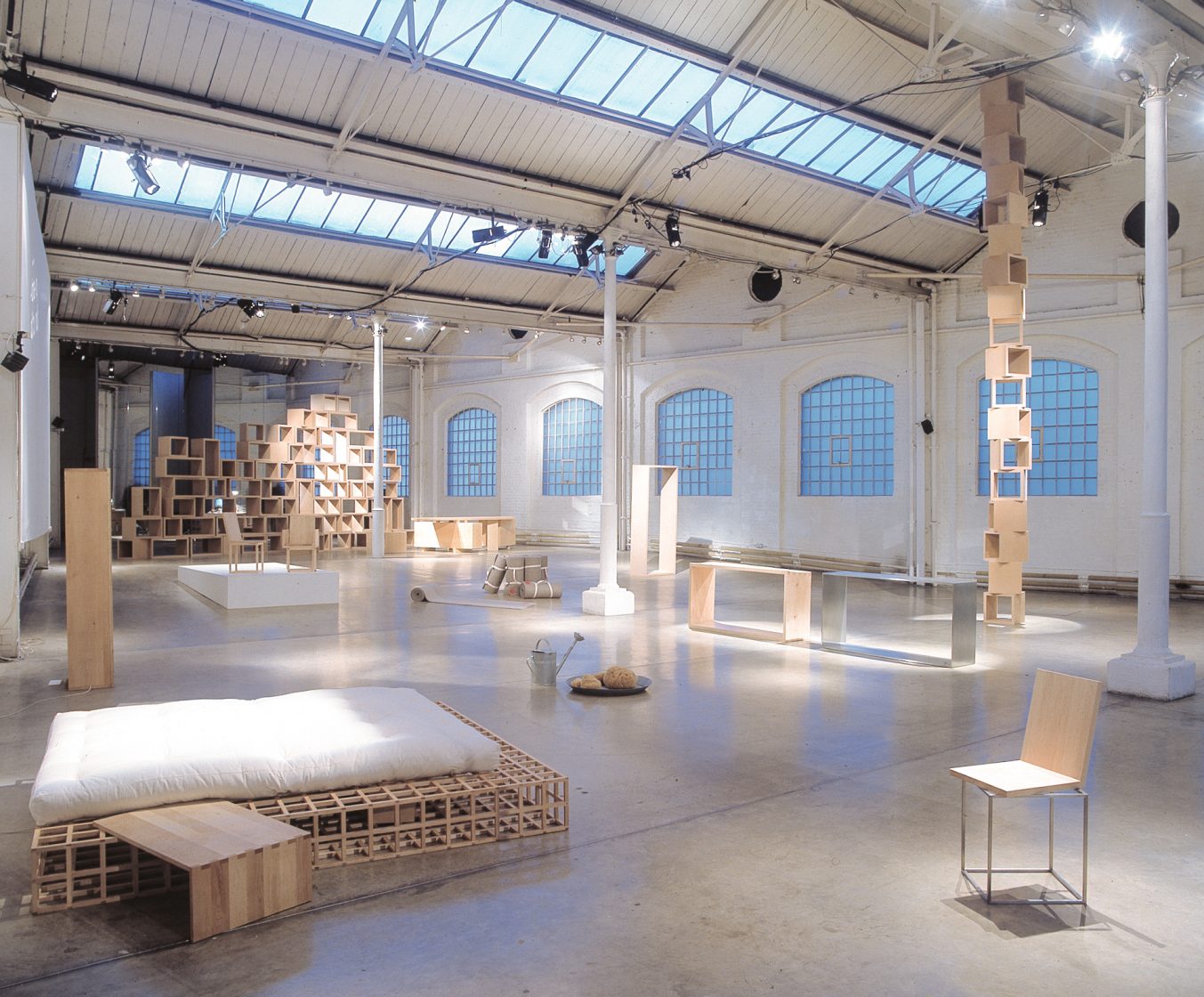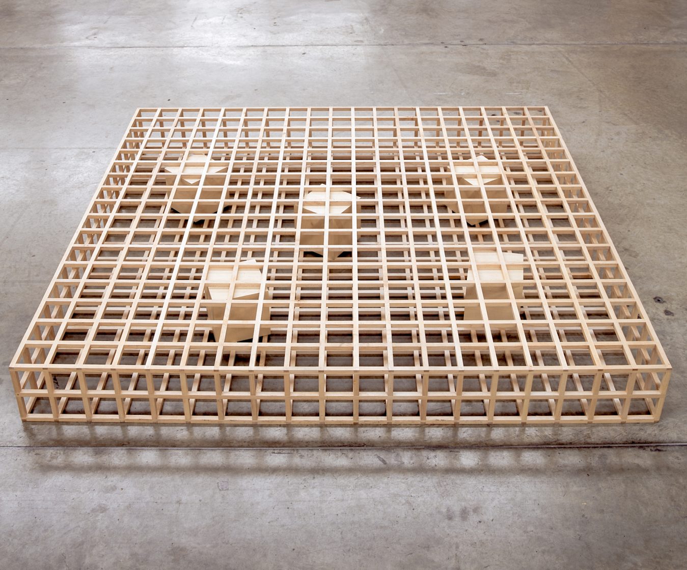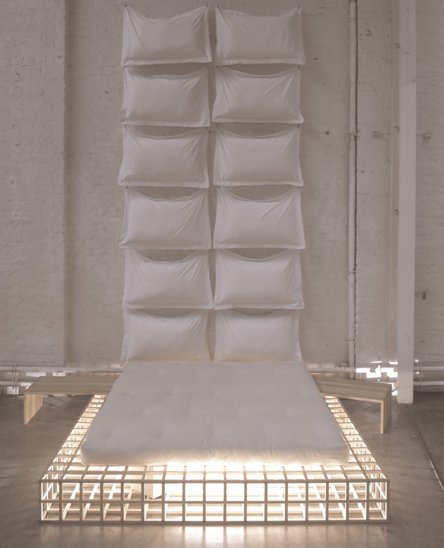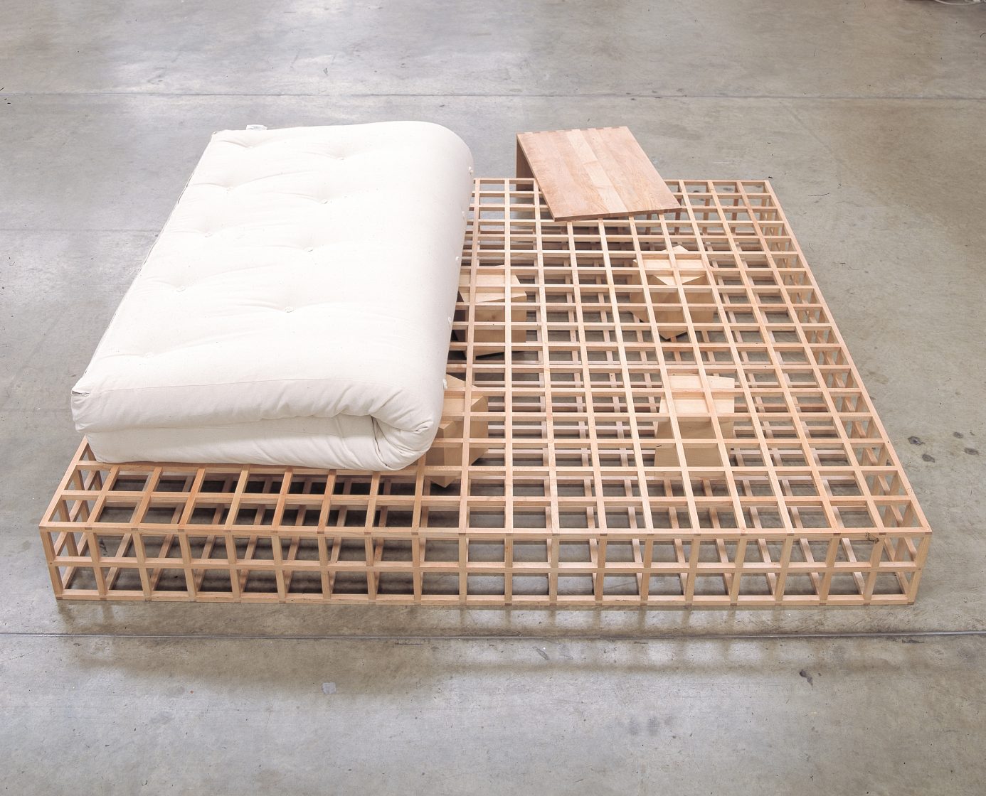 Vice 1994 maple wood, futon mattress H 26 x W 220 x D 200 cm A deconstructed, minimalist bed, made using a wooden lattice structure and created for the Switch House.
