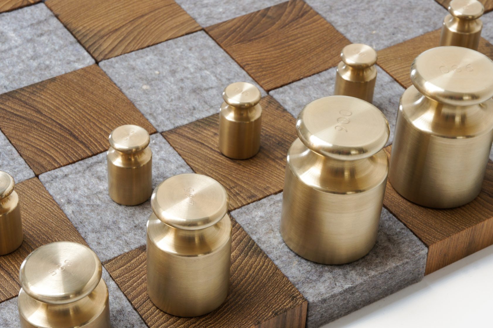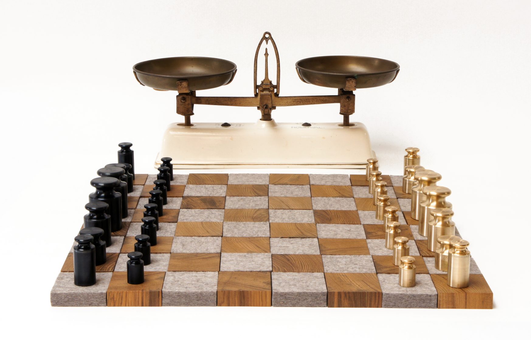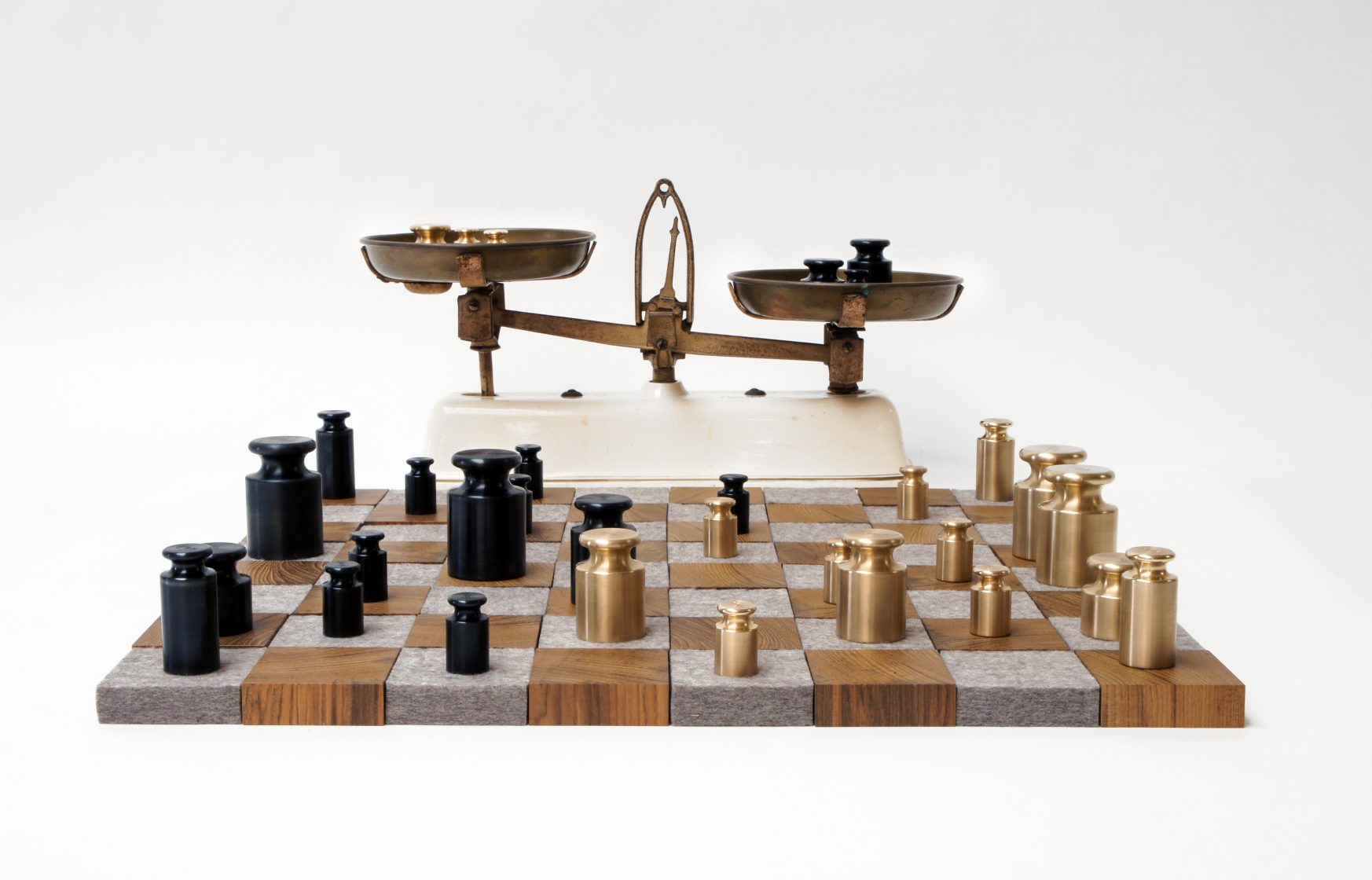 Traditional chess pieces are replaced with brass weights. Each weight is calibrated to reflect the importance of the chess piece it represents. Throughout the game, players are able to literally ‘weigh up the competition’, through the use of the scales, which shows the current state of play and offers a unique interpretation of the game.