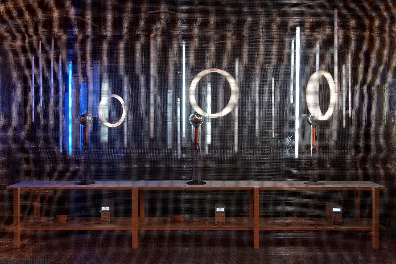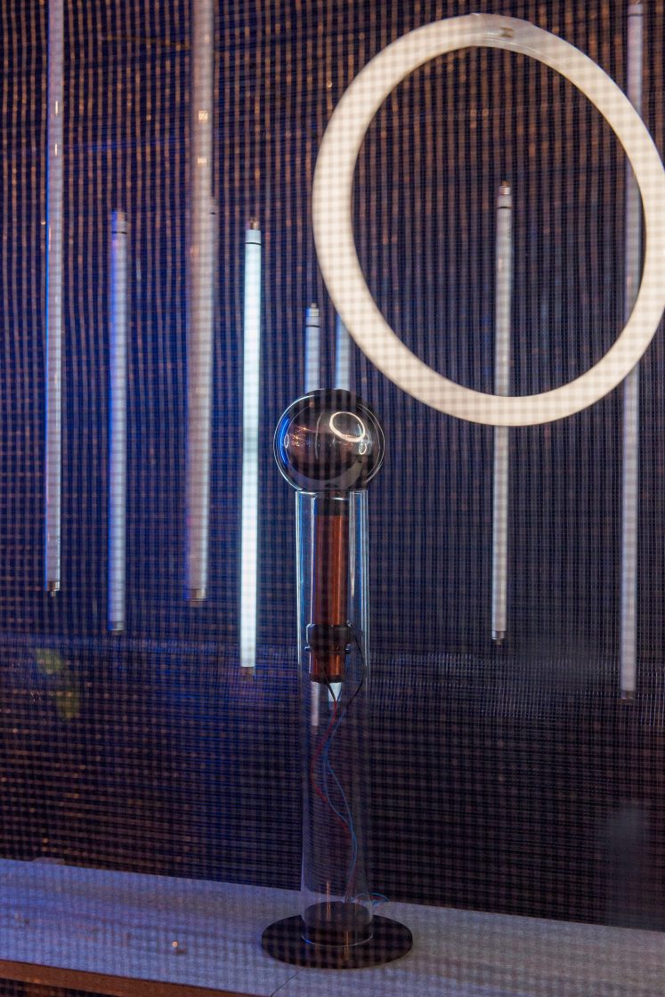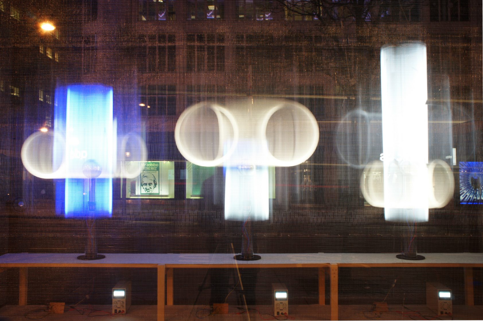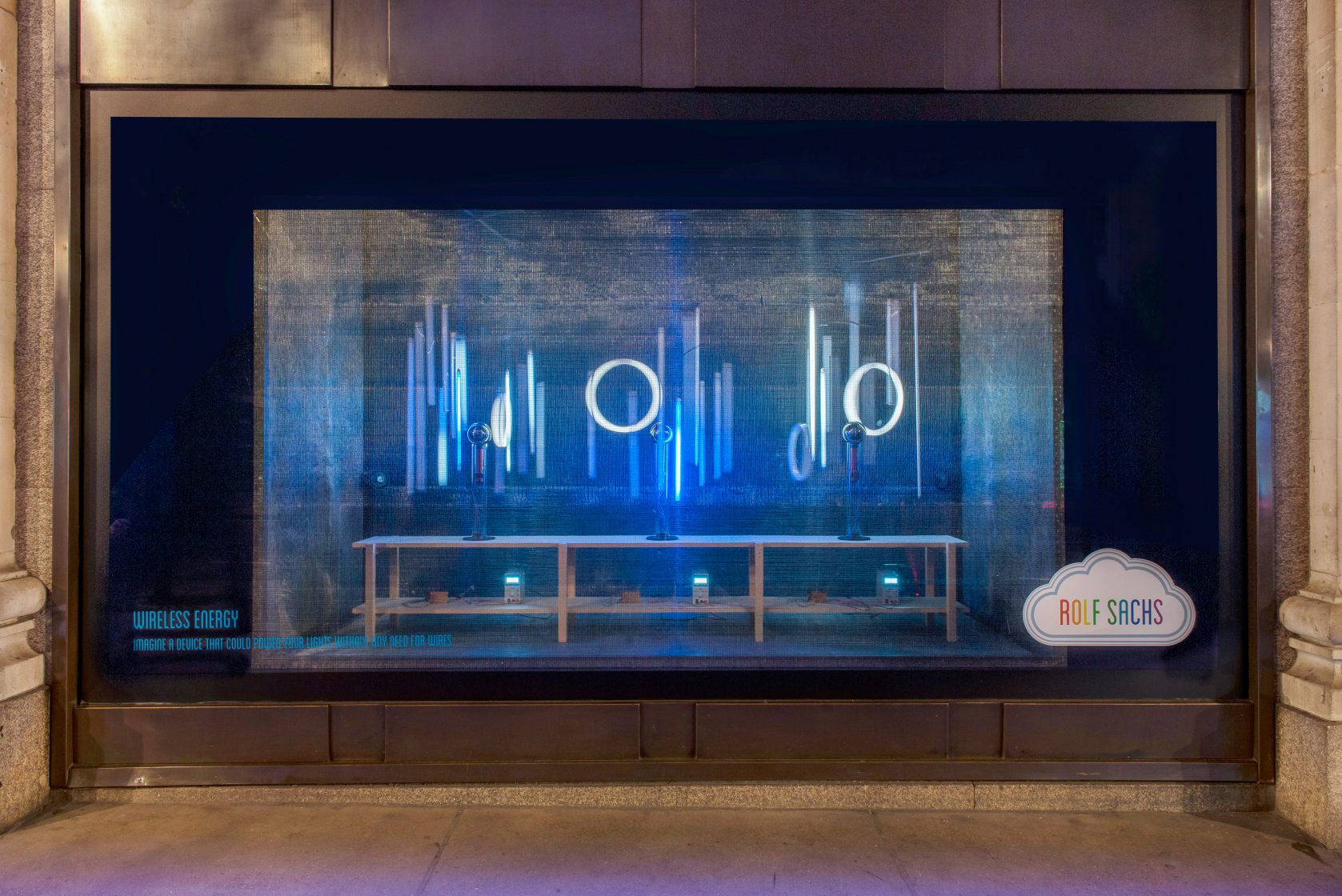 This window concept, which forms part of Selfridges’ ‘Festival of Imagination’, is inspired by the work of the Victorian inventor Nikola Tesla. The installation consists of three ‘Slayer Exciters’ (low voltage emitters), which generate a local energy field. As the neon lights move close to the emitter, the neon gas becomes ‘excited’, creating a mesmerising and poetic light display.